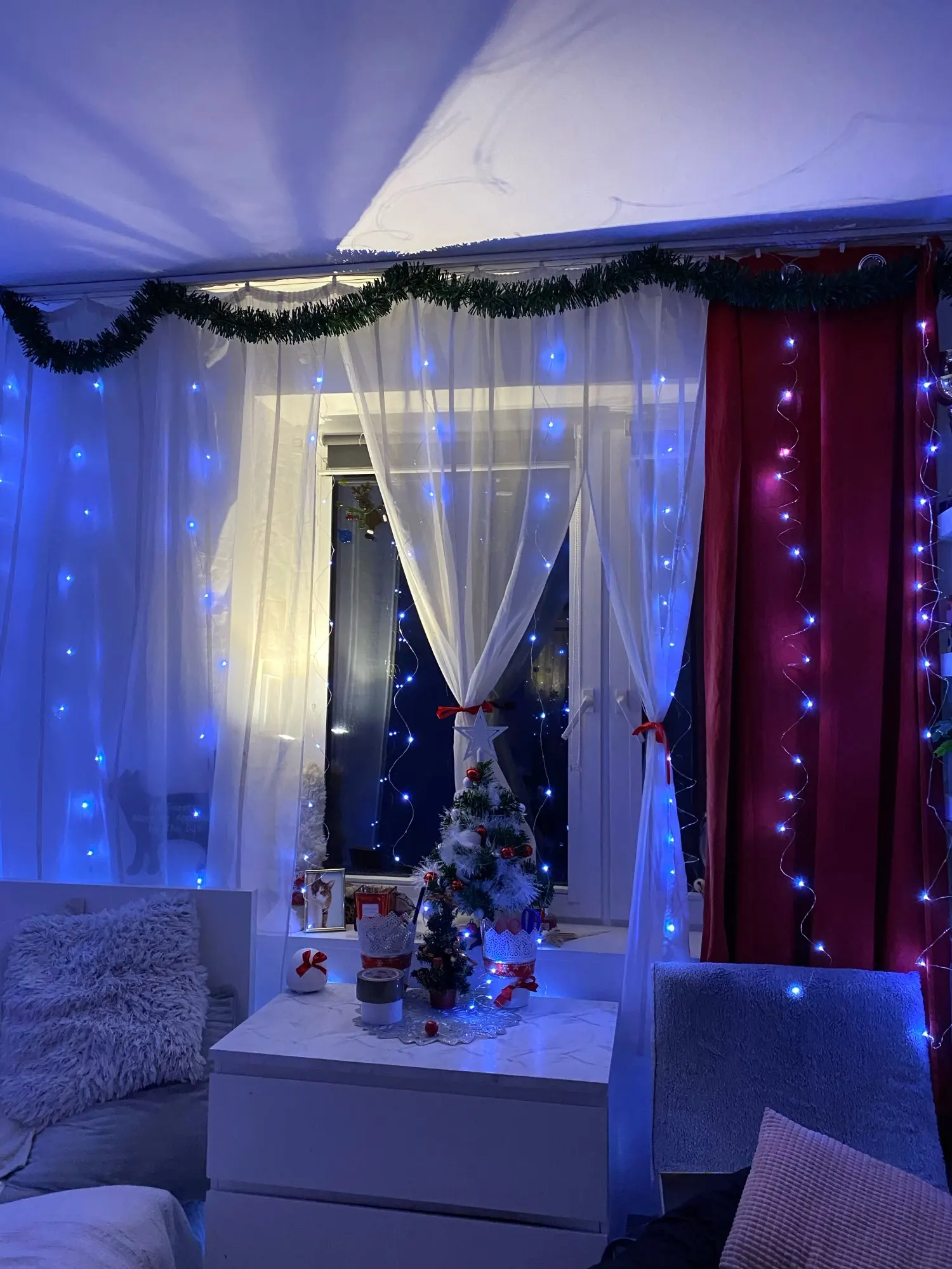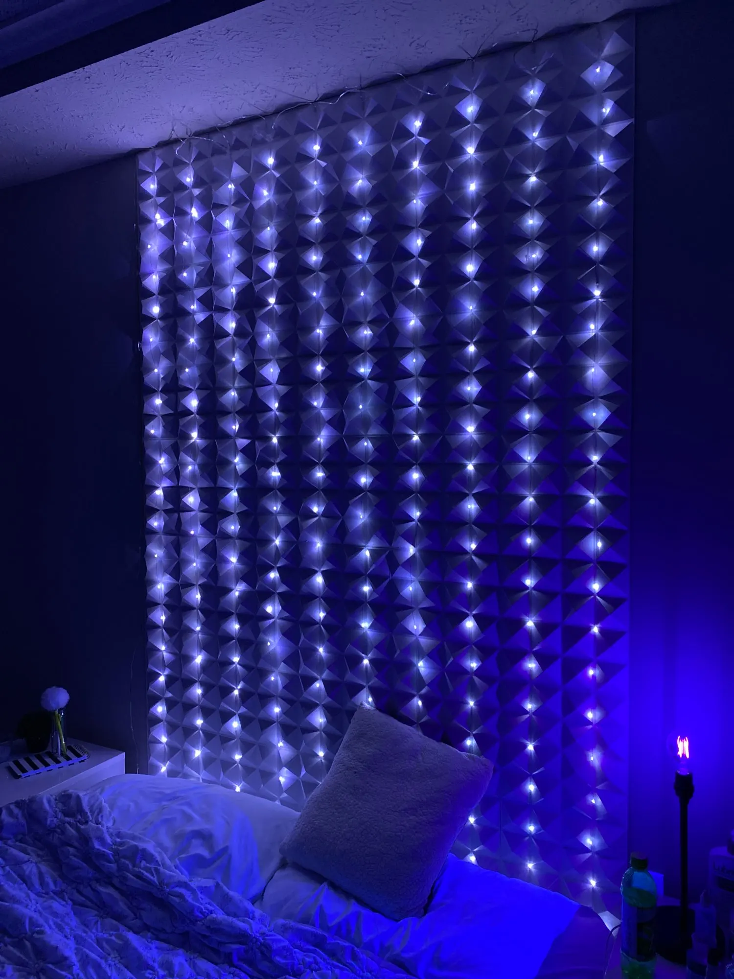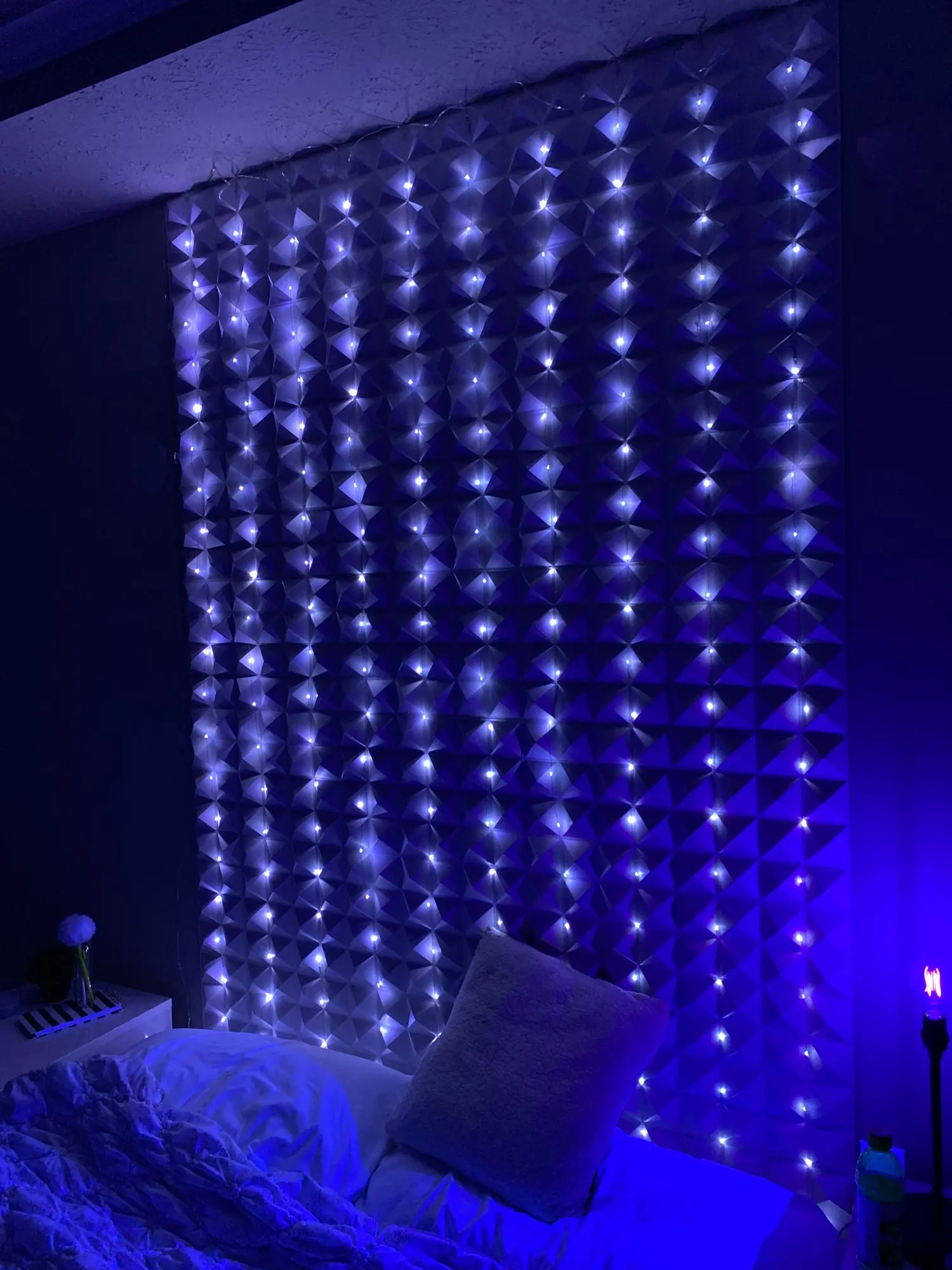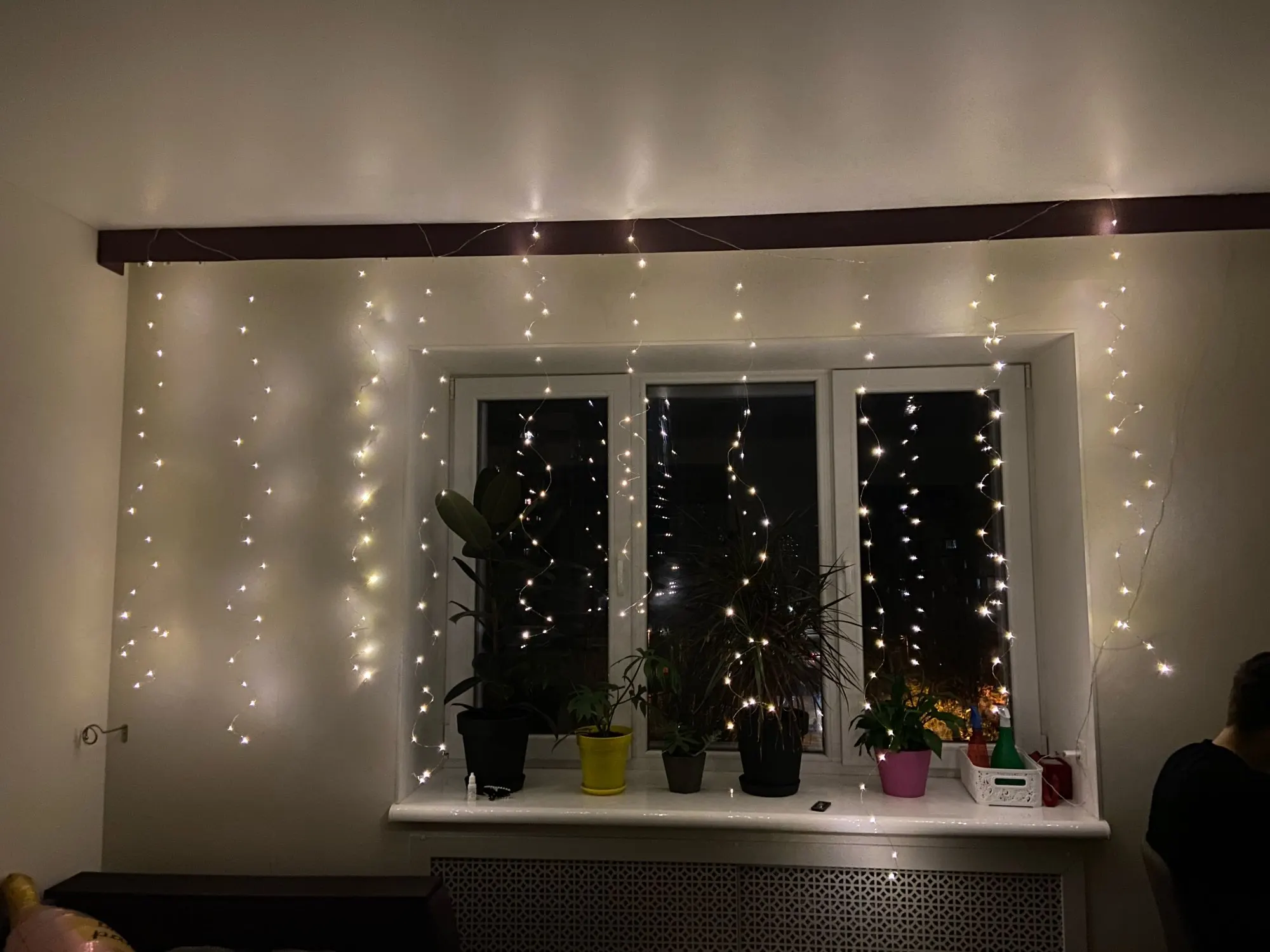 Совершенно потрясающая гирлянда! 1) Благодаря usb выходу может работать везде, где нет розеток. У нас питается от повербанка. 2) Очень удобный пульт управления, лежит рядом с кроватью, перед сном выключается не вставая с кровати. 3) Регулировка яркости - оказалось очень удобной и часто используемой функцией, ночью яркость ставится на минимум. Гирлянда выглядит не совсем традиционно, провода похожи на оголенные с капельками светодиодов ) Сначала выпрямили их, но потом решили оставить смотанными в спираль - так смотрятся интереснее (хоть и меньше по высоте). По ширине расстояния между гирляндами достаточно большое, поэтому имеет смысл брать большую ширину. Единственный минус - такие провода привлекли внимание кота, часть гирлянды он отгрыз, но на работоспособность это не повлияло )