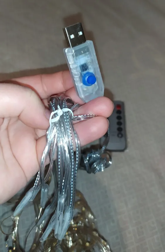 Очень красивая гирлянда, великолепный синий цвет, включается-выключается с пульта, режимы тоже меняются с пульта. Подключается к usb. Упакована была хорошо, пришла быстро. Рекомендую!