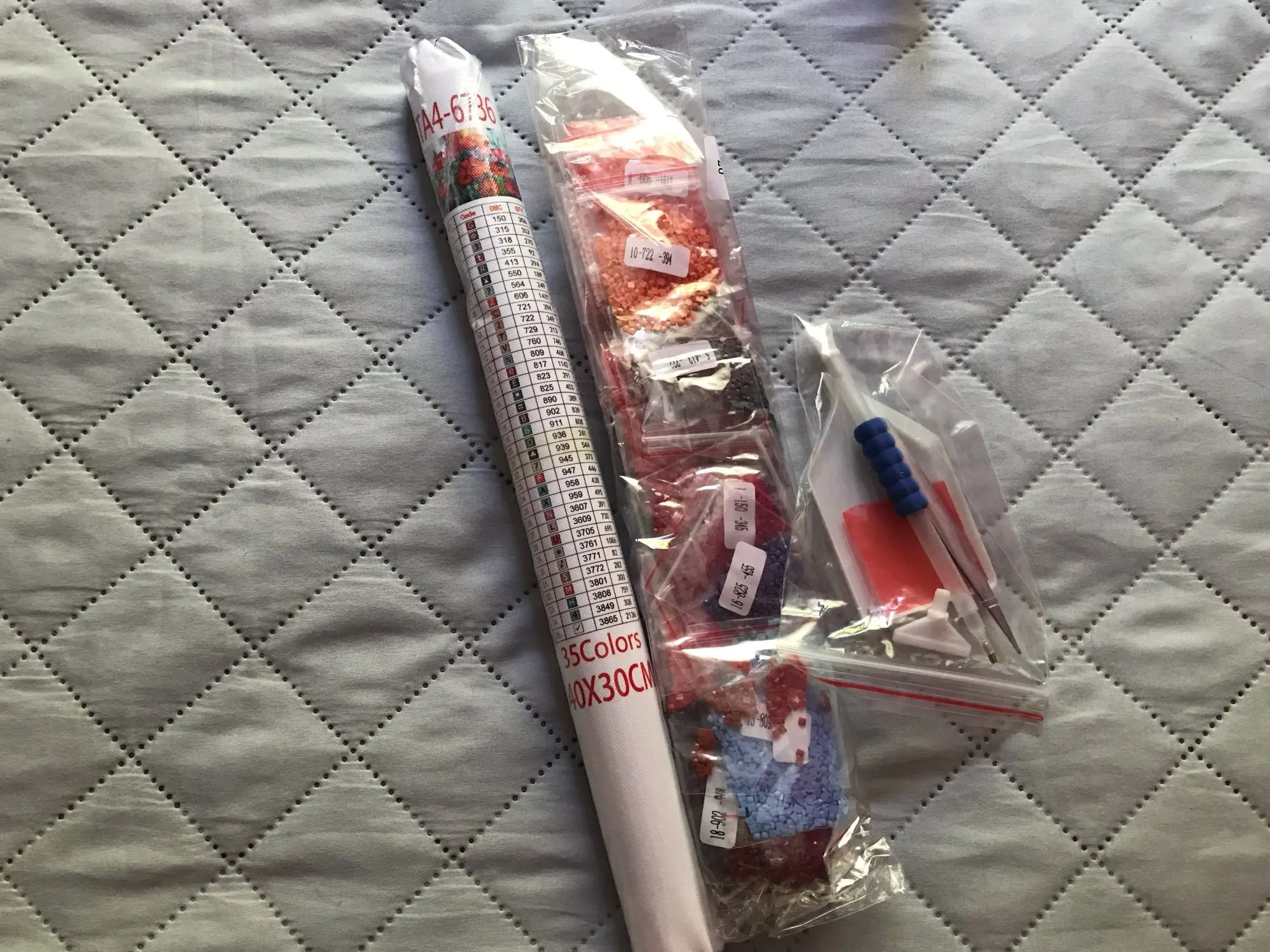 Получено через 2 недели в пузырьковом конверте с другой краской, заказанной одновременно. Полный комплект для каждой краски. Бриллианты яркие. Я не могу дождаться, чтобы начать их. Я рекомендую этого продавца.