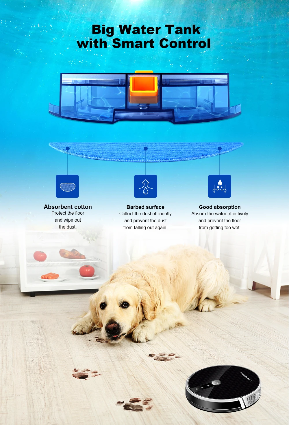 6. Электрический резервуар для воды обеспечивает даже просачивание воды. Просачивание воды автоматически останавливается, если робот перестает работать. Огромный объем воды 350 мл обеспечивает непрерывную влажную уборку до 100 минут.