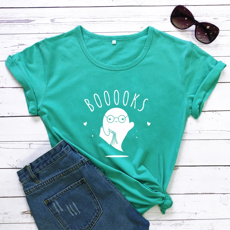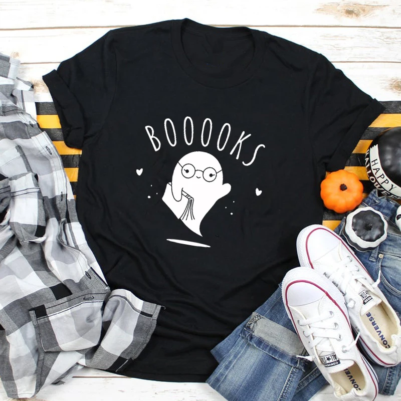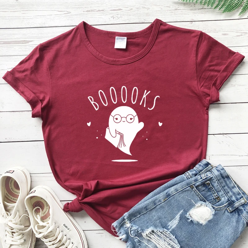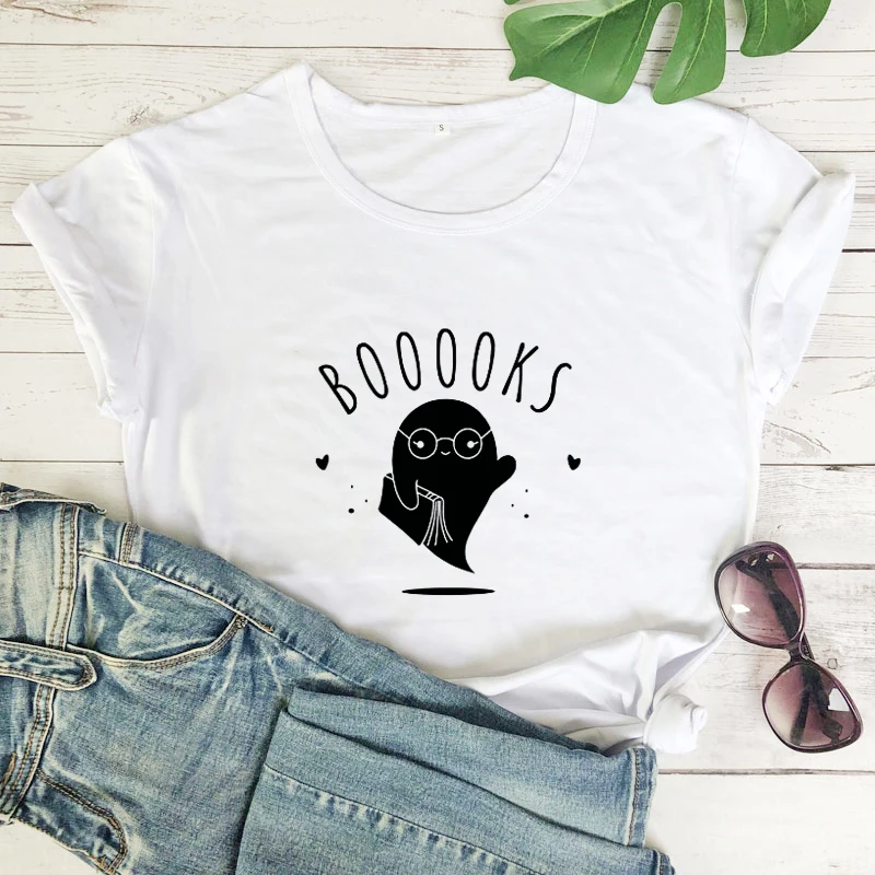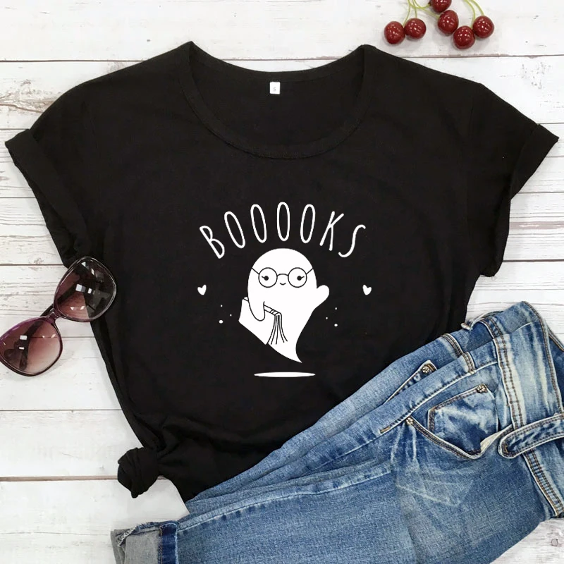 Футболка Booooks из 100% хлопка с изображением призрака, забавный подарок на Хэллоуин, футболка для учителя, Милая женская футболка с изображением графической книги, топ для чтения, футболка