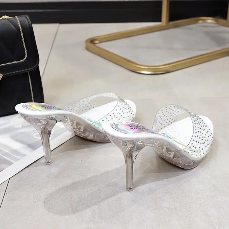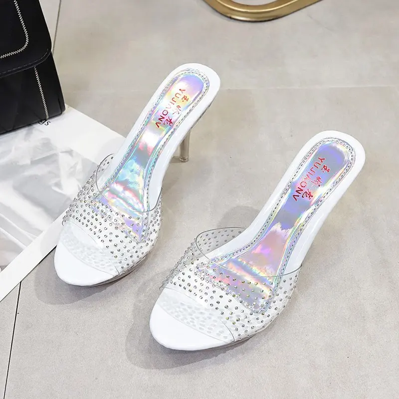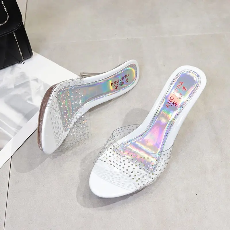 Сандалии Voesnees женские, прозрачные шлепанцы с кристаллами, пикантная Уличная обувь на высоком каблуке 9 см, с открытым носком, для дома и улицы