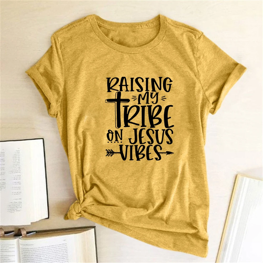 Женские футболки с принтом Raising My Tribe on Jesus Vibes, летние свободные футболки с круглым вырезом в стиле Харадзюку, модная женская одежда