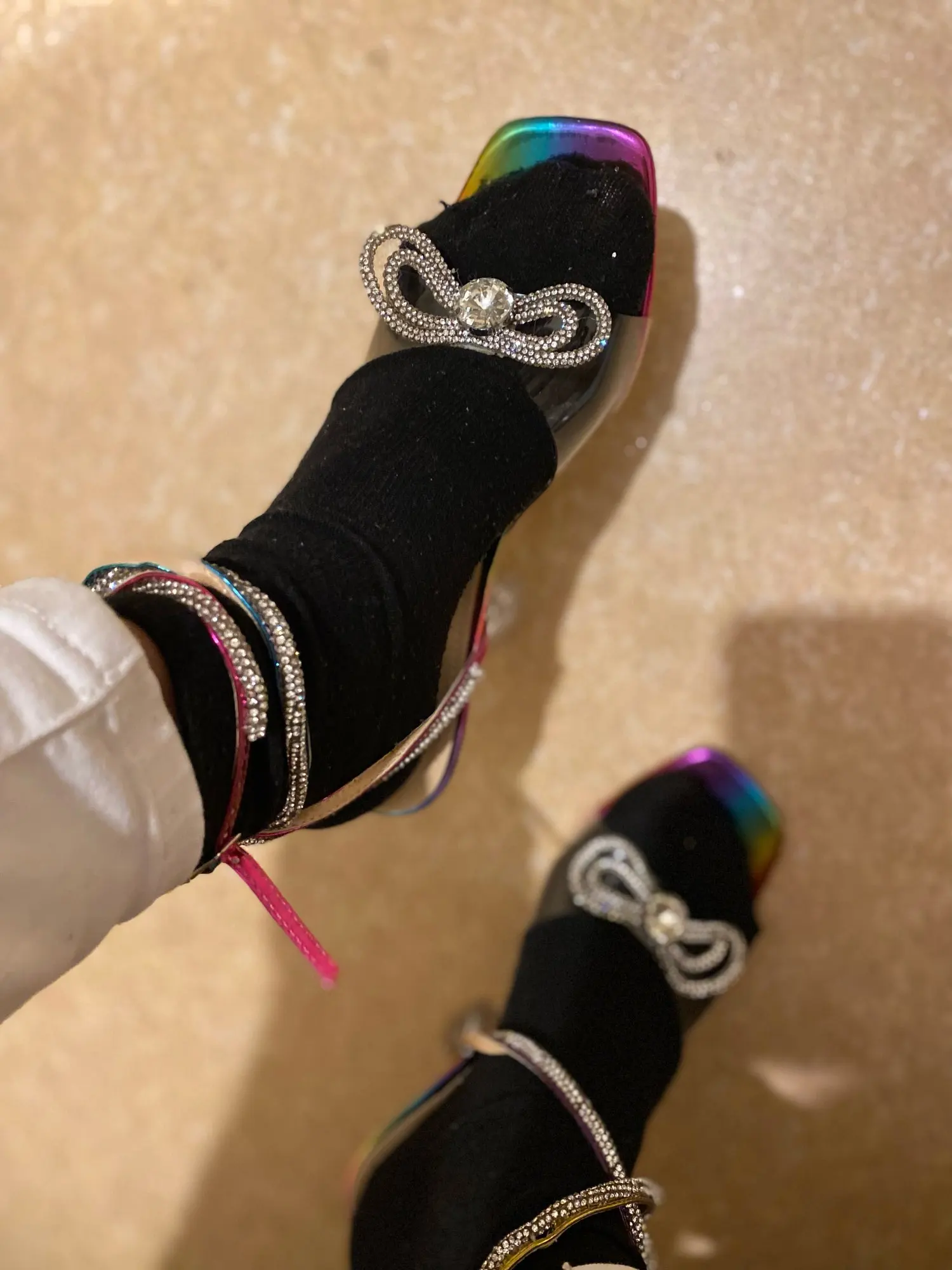 Босоножки женские Eilyken, на каблуке-шпильке, с узким ремешком, стразы, с бантиком, Размеры 35-42, лето сандалии с квадратным носком