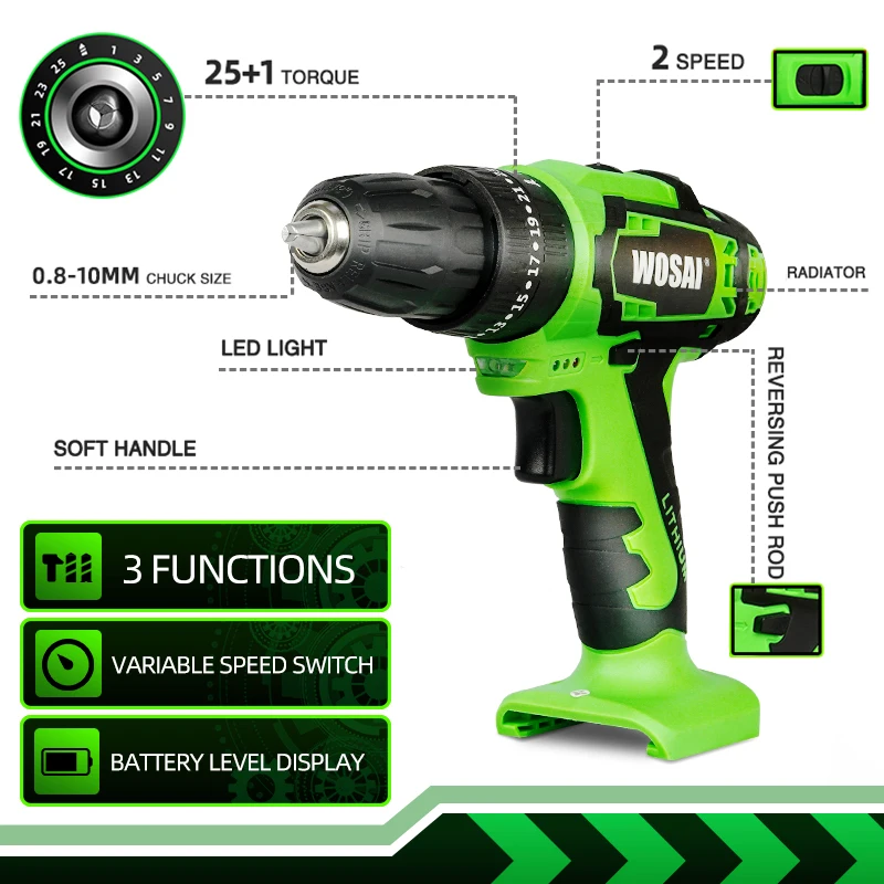 Дрель-шуруповерт WOSAI аккумуляторная, 12 В, 28 нм, 3 функции