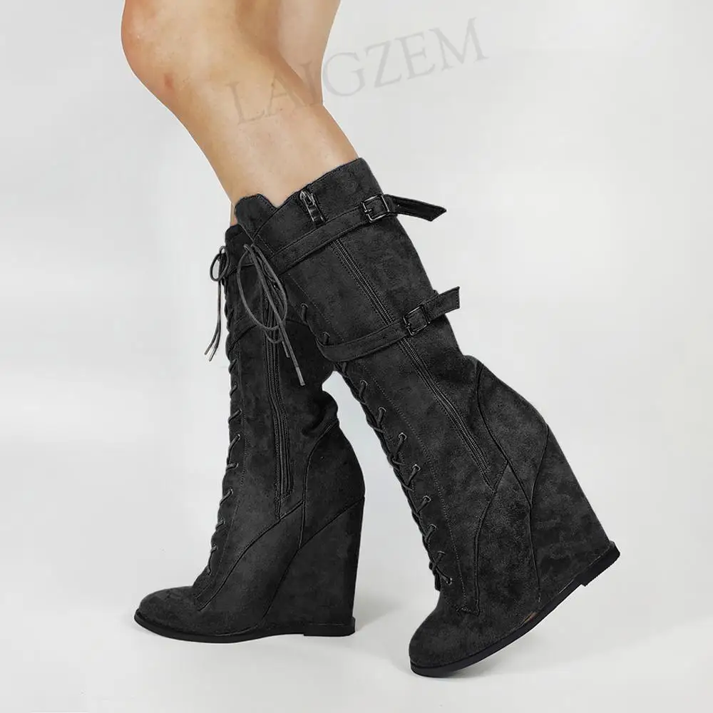 Женские винтажные сапоги до середины икры DOBANER, сапоги на танкетке с боковой молнией и круглым носком, из искусственной замши, большие размеры 43, 44, 47, 50, 52