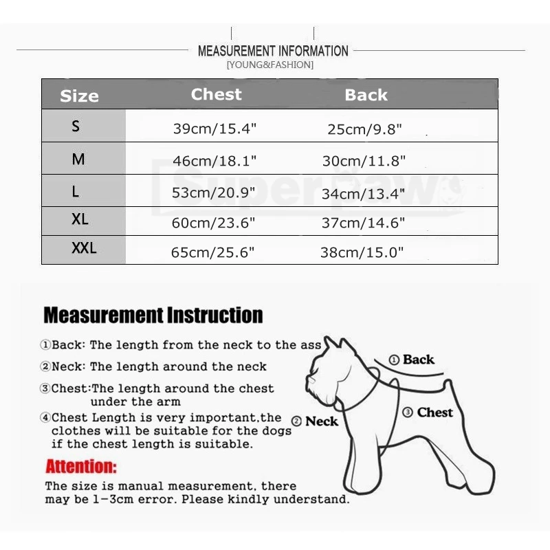 2. Для двух ног, пожалуйста, обратите внимание на обхват груди, и для четырех ног, должны соответствовать обхвату груди и длине спины.