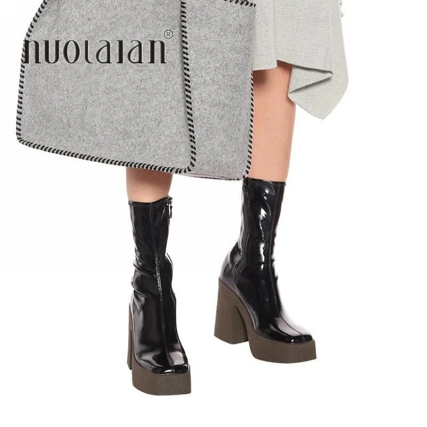 Женские ботильоны из эластичной кожи, черные коричневые ботинки на платформе и высоком каблуке, Осень-зима 2021