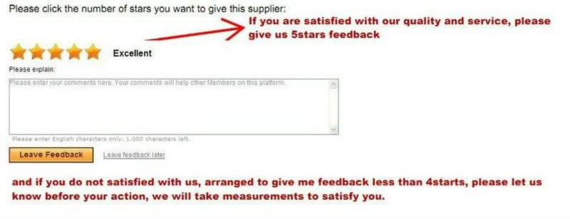 Поскольку их отзывы очень важны для развития нашего бизнеса, мы сердечно даем им положительные отзывы, если они удовлетворены нашим продуктом и обслуживанием. Это займет всего минуту. Спасибо.