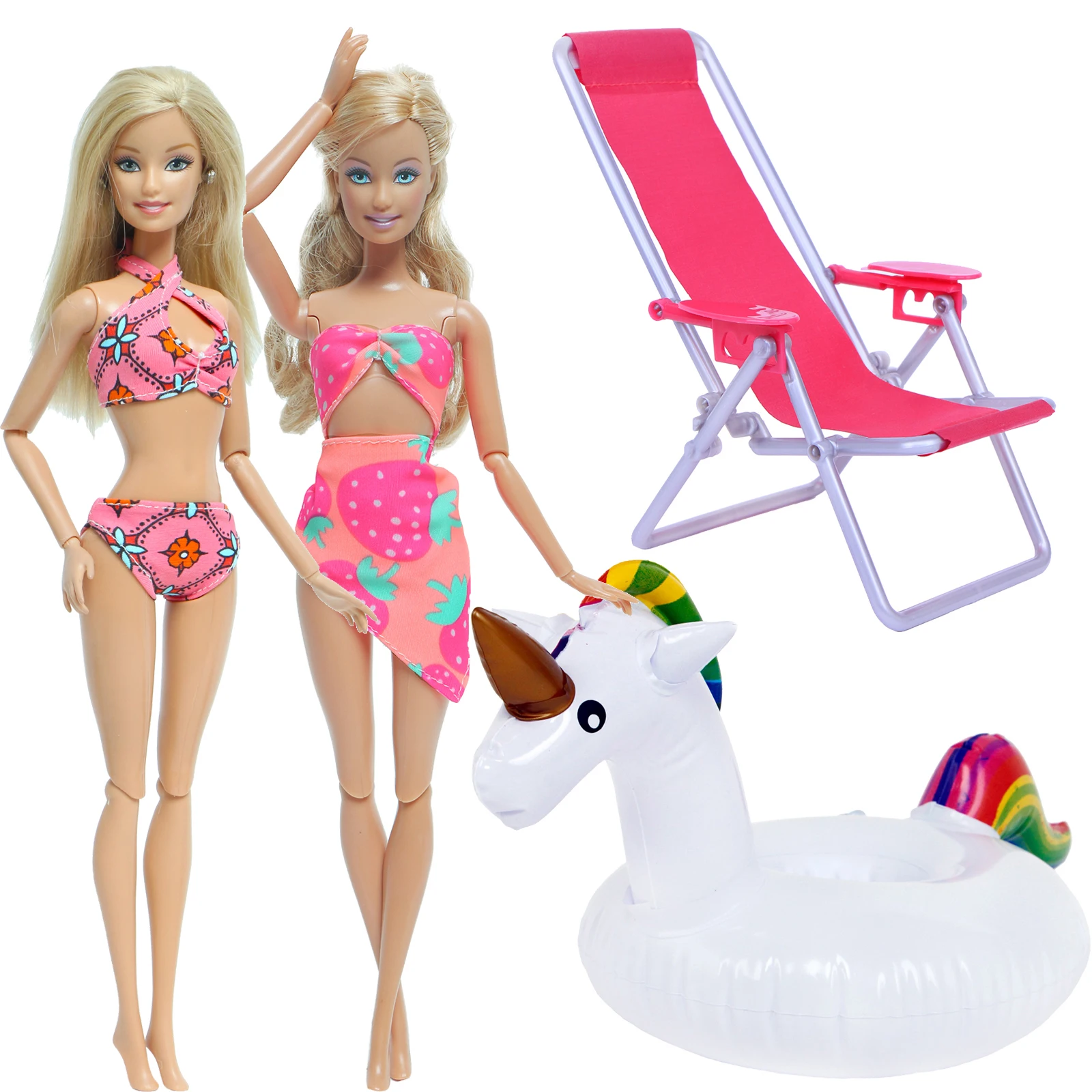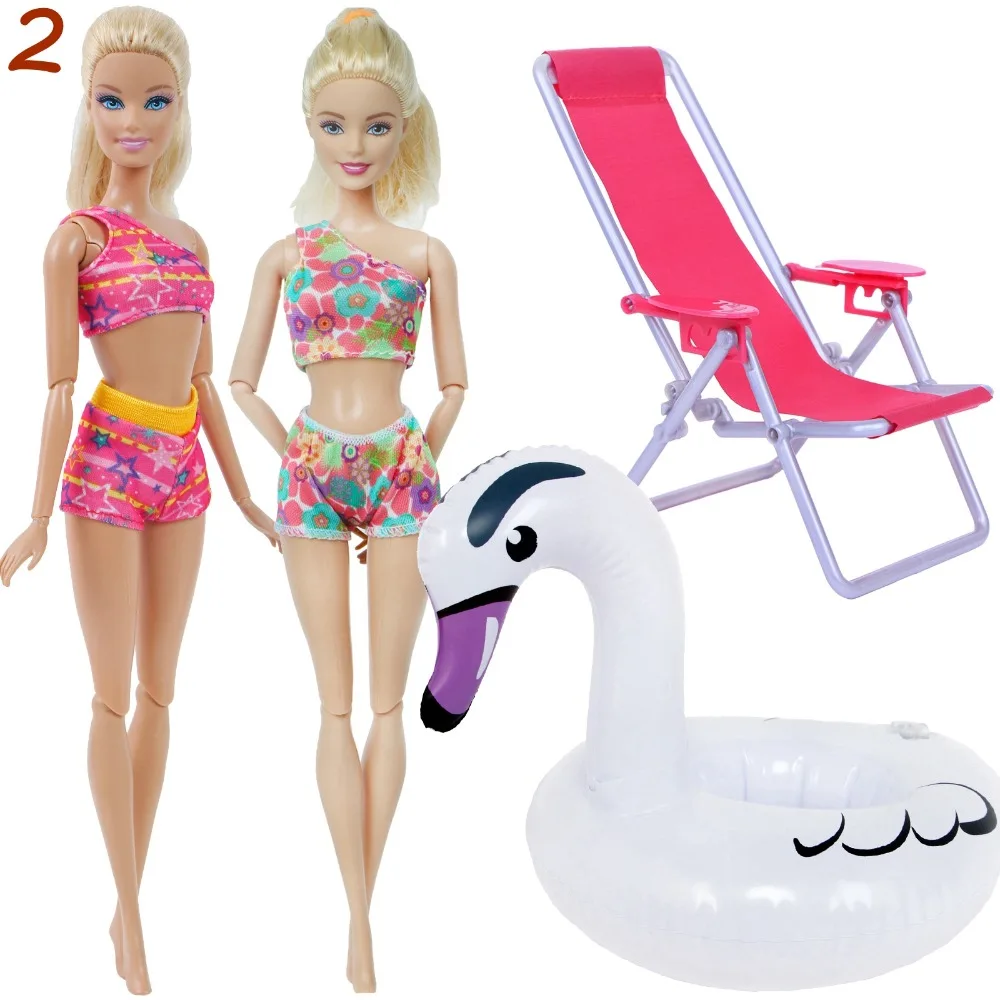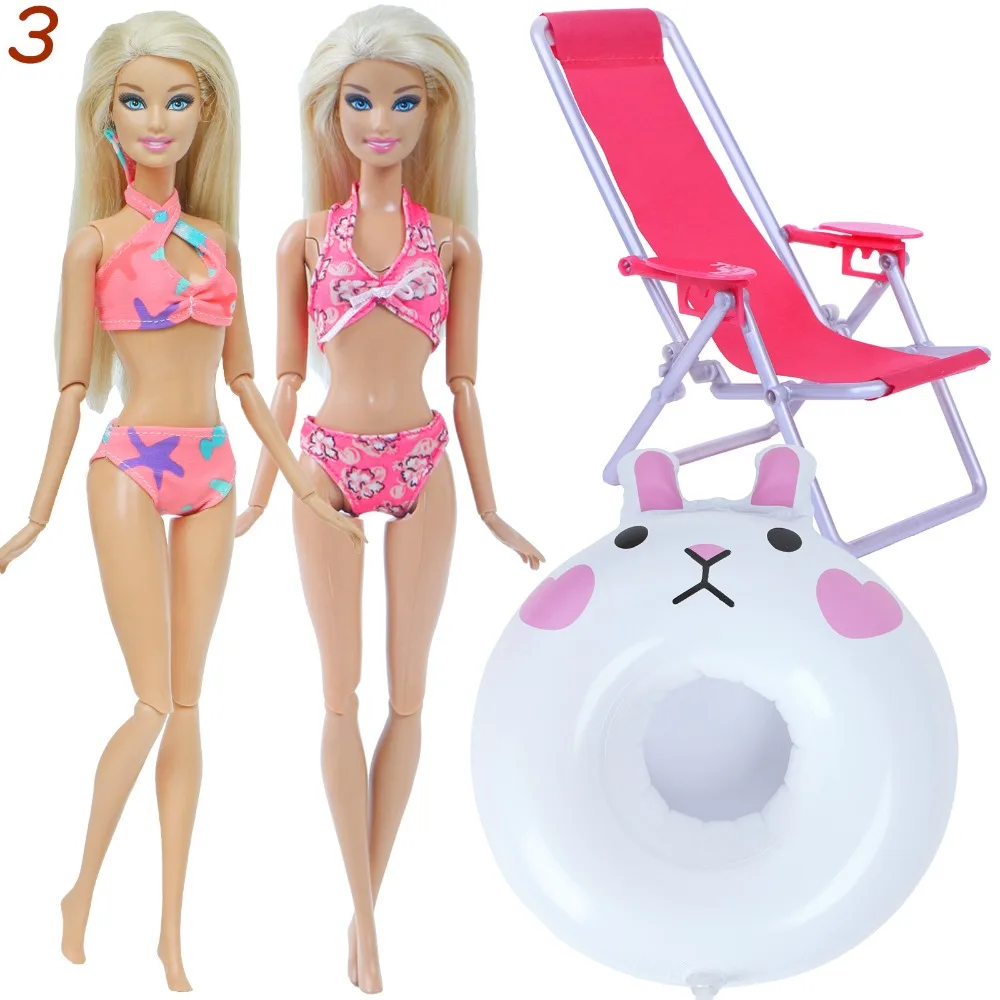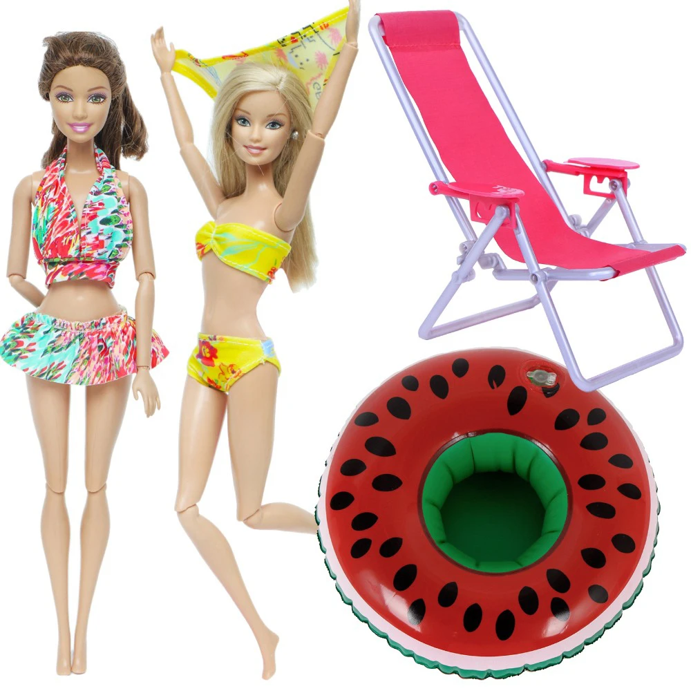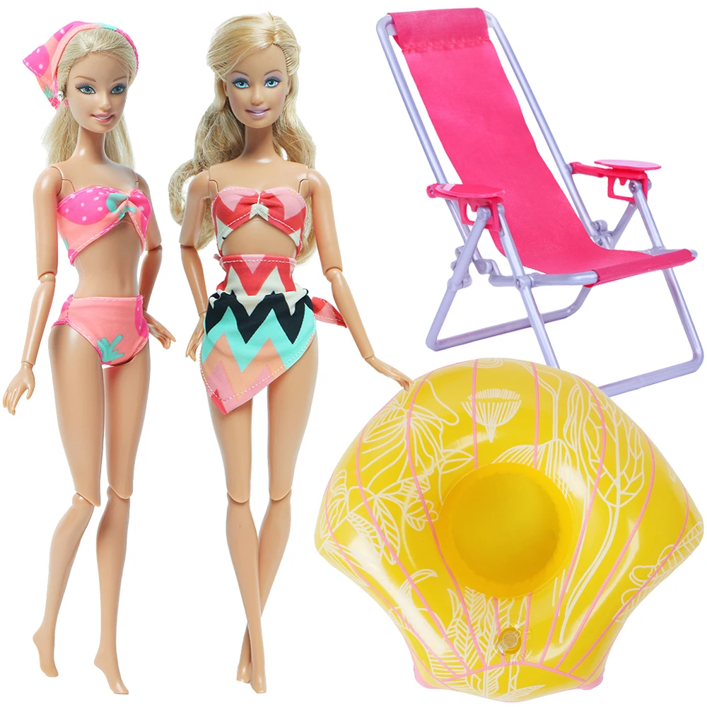 Аксессуары для кукол 4 предмета = 2 Купальника Бикини + 1 пляжный стул + 1 Надувной круг для плавания, Одежда для куклы Барби Комплект детских игрушек