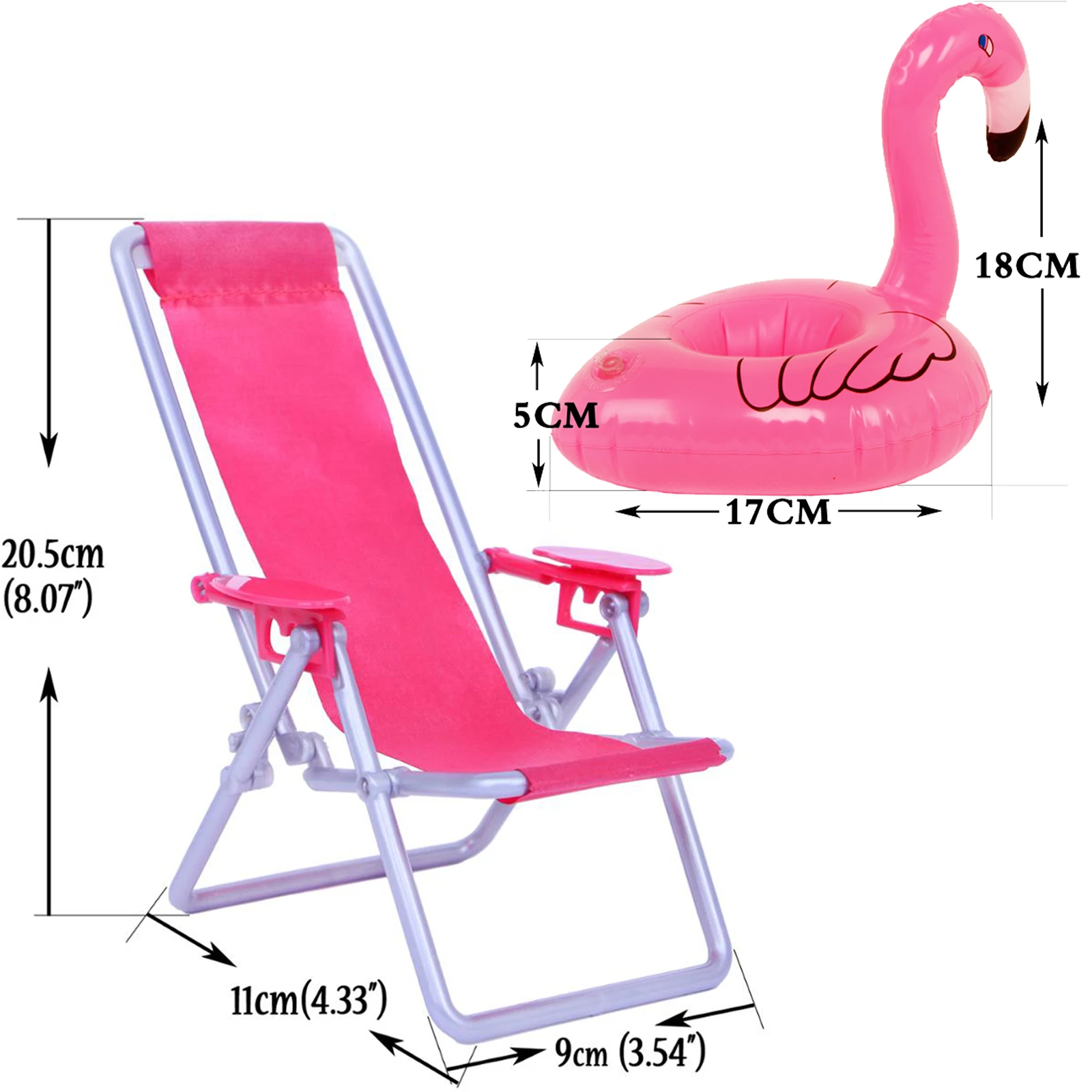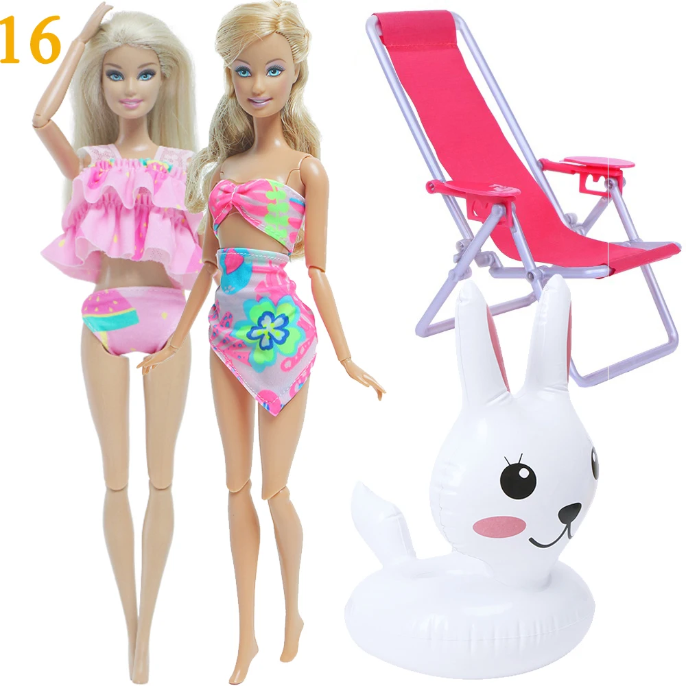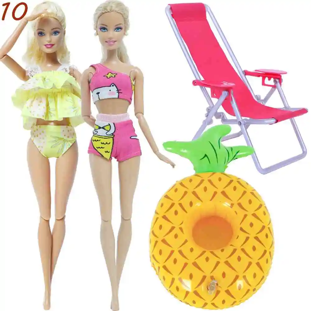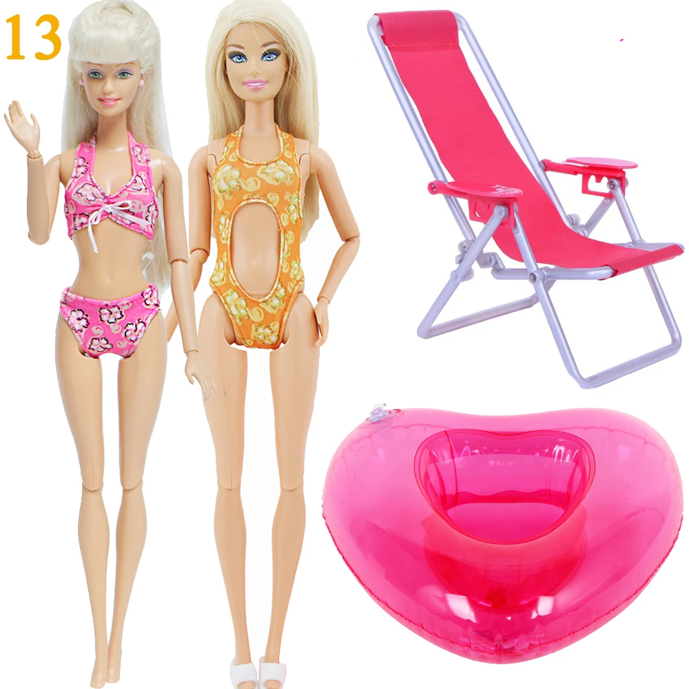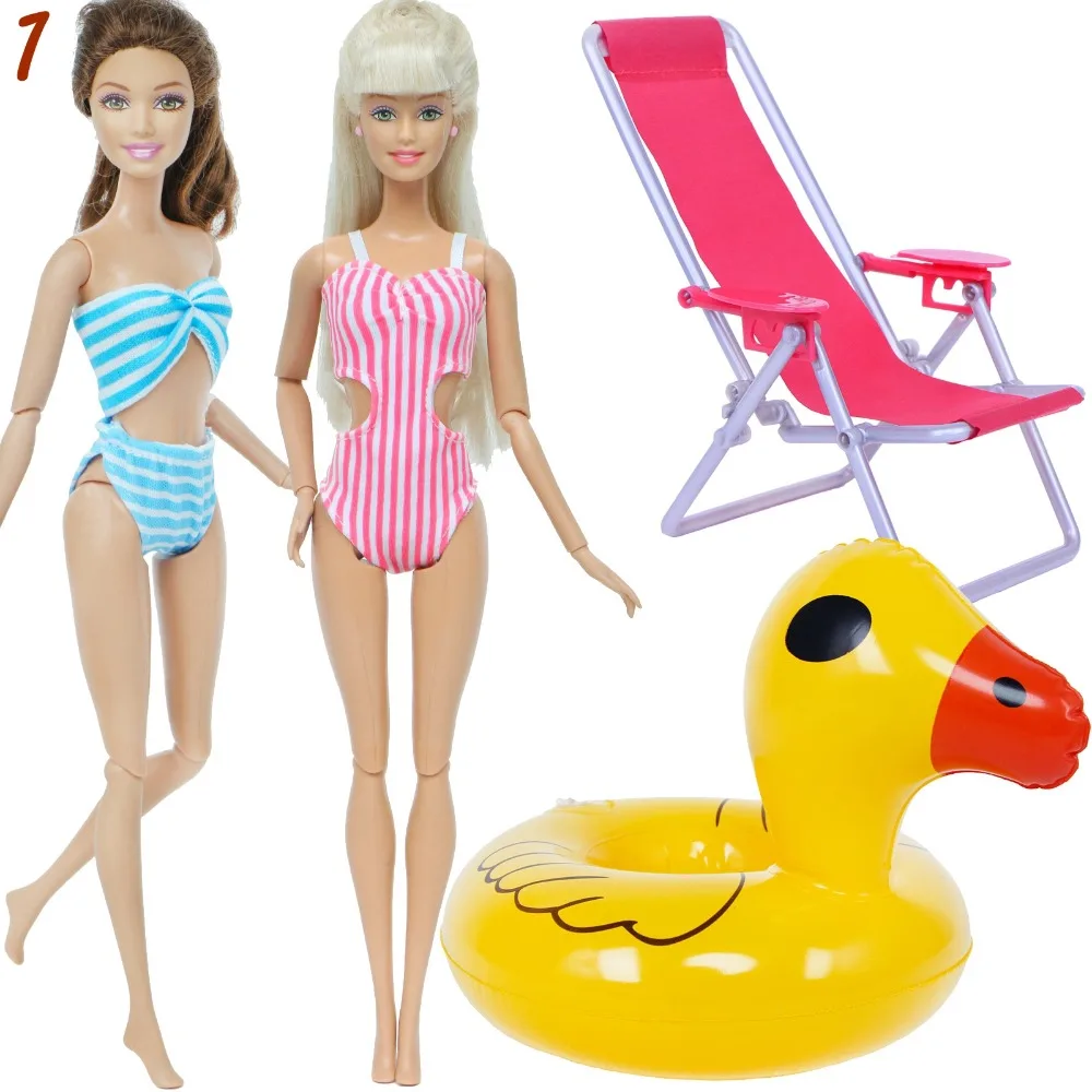 Аксессуары для кукол 4 предмета = 2 Купальника Бикини + 1 пляжный стул + 1 Надувной круг для плавания, Одежда для куклы Барби Комплект детских игрушек