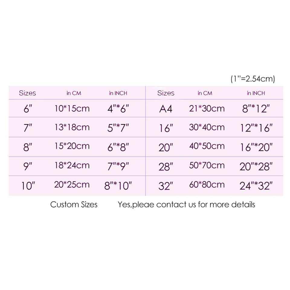 size10x15cm 13x18cm 15x20cm 20x25cm 21x30cm 30x40cm 40x50cm 40x60cm etc.