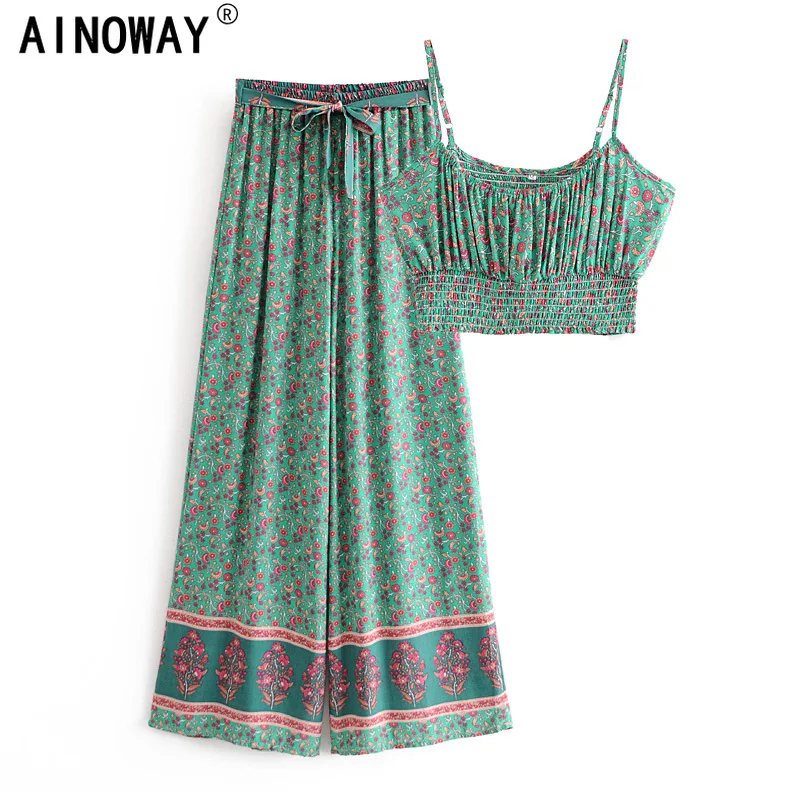 Винтажные шикарные женские костюмы из двух предметов, Топы без бретелек, богемные брюки с эластичным поясом, наборы из искусственного хлопка в стиле бохо