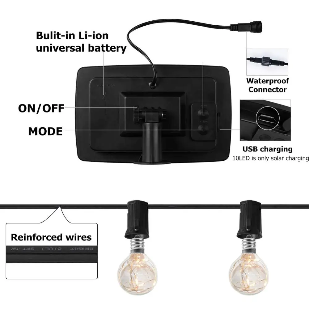 1. Питание от солнечной энергии: Этот теплый белый светодиодный светильник питается от солнца, экономя деньги и энергию на электричестве. Поставляется с литий-ионной перезаряжаемой батареей. 4-8 часов солнечной зарядки может обеспечить до 16 часов рабочего времени. Солнечные панели можно установить на стену или использовать пакет (посылка входит в комплект) для наземного монтажа. (Пожалуйста, нажмите кнопку включения перед зарядкой.)2. Прочный Внутренний/наружный струнный светильник S: украшен 10/25 лампами высокого качества, чтобы защитить светильник от дождя и поломки, с 50000 часов работы лампы, гарантирована долговечность.3. Удивительное освещение 4 режима: получите livelier с потрясающим разнообразием четырех режимов освещения, призванных успокоить вас в каждом настроении, устойчивом на месте; Медленная вспышка, быстрая вспышка и импульсная вспышка. Идеальное освещение для веселого вечера!4. Сдвоенный порт зарядки варианты: 25LED стиль с premium 5,5 V/3W солнечная панель и USB зарядки, ничего не ошибетесь! Вы можете выбрать 2 классных варианта, 8 часов зарядки для солнечной панели и 4 часа для зарядного устройства USB.(10 светодиодов только для солнечной зарядки, а не usb-порта для зарядки)5. Класс водонепроницаемости IP65-наши светодиодные лампы для патио могут использоваться в любых погодных условиях даже при сильном дожде. Высокое качество провода и водостойкие лампы защиты делают наружные огни струны работать круглый год на вашем заднем дворе, держать ваш задний двор ярче и сияющей. Гирлянда идеально подходит для украшения дома в помещении, как патио, сад, палуба, бистро, кафе, беседка, сад, газон, рынок, свадебные праздники и другие вечерние мероприятия.6. Гарантия: мы предлагаем 1 год гарантии качества. Гарантия 100% соответствия (за исключением ламп). Пожалуйста, не стесняйтесь связаться с нами, если у вас есть какие-либо проблемы с качеством, мы предоставим вам лучшее послепродажное обслуживание.7. Не беспокойтесь: Вы можете купить светильник в качестве замены в нашем магазине, когда вы случайно сломаете его. Аккумуляторная батарея 18650 также легко найти на рынке, и через несколько лет вы можете приобрести ее в качестве замены после нескольких лет слива батареи.