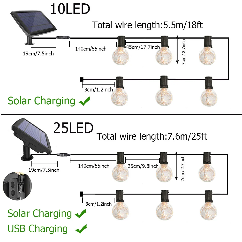 · Панель солнечных батарей: 5,5 V 3WСветодиодный светильник G40: 25 шт.· Рабочий ток:<200 мА· Батарея: 3,7 V 2200mAh 18650 литиевая батарея x 2 шт.· Время зарядки: 4-6 часов· Время работы: 8-12 часов· Длина: всего 7,6 м/25ft, солнечные панели кабель подключения конец 0,2 м/0.65ft, Соединительный конец до первой лампы составляет 1,39 м/4.56ft, расстояние между каждым лампы 0,25 м/0.82ft.· Зарядка через USB: Не используйте более 5 В, 1 А зарядную розетку для зарядки, это сгорит батареи!Мы рекомендуем использовать источник питания компьютера или блок питания ниже 5 в 1 а для зарядки.