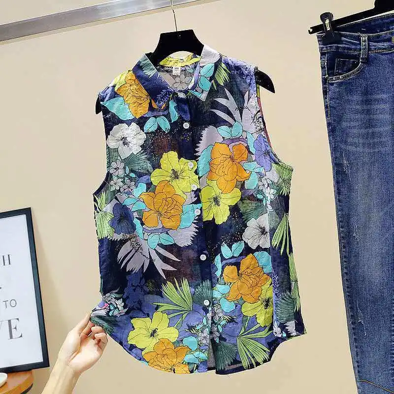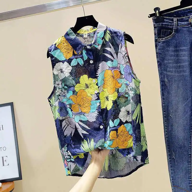 Блузка женская хлопковая с принтом, рубашка без рукавов, с воротником Питер Пэн, корейский стиль, Свободный Топ, весна-лето, SP651