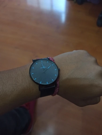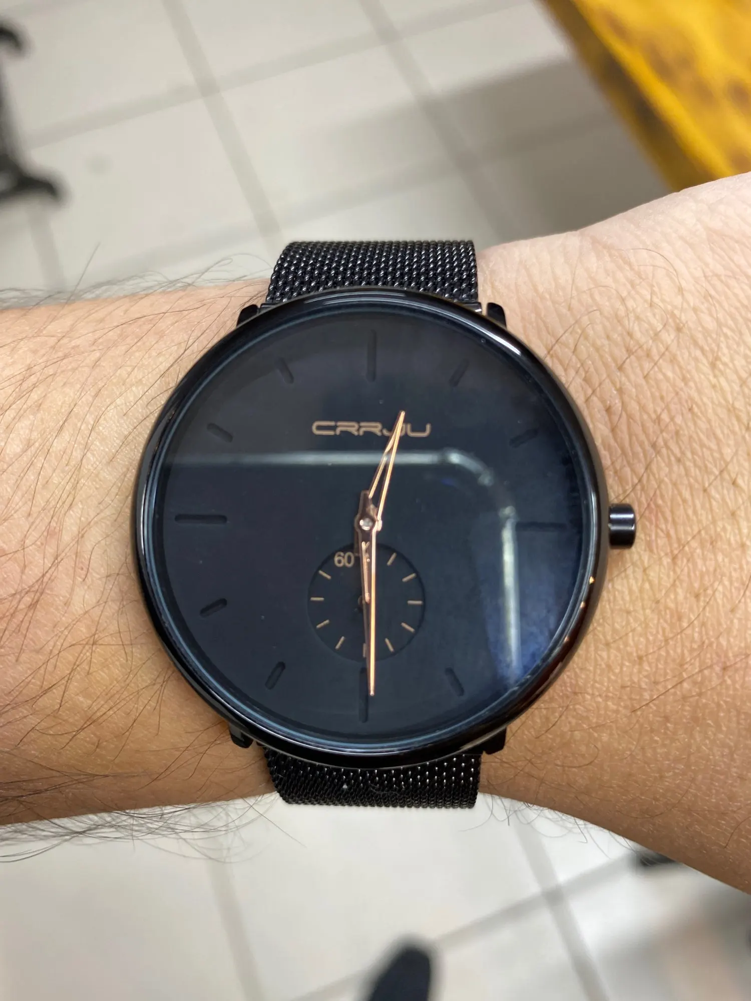 Bem elegante. Tamanho mediano, meu pulso é fino e ele ficou ótimo. Ponteiro de hora, minuto e segundos funcionais.