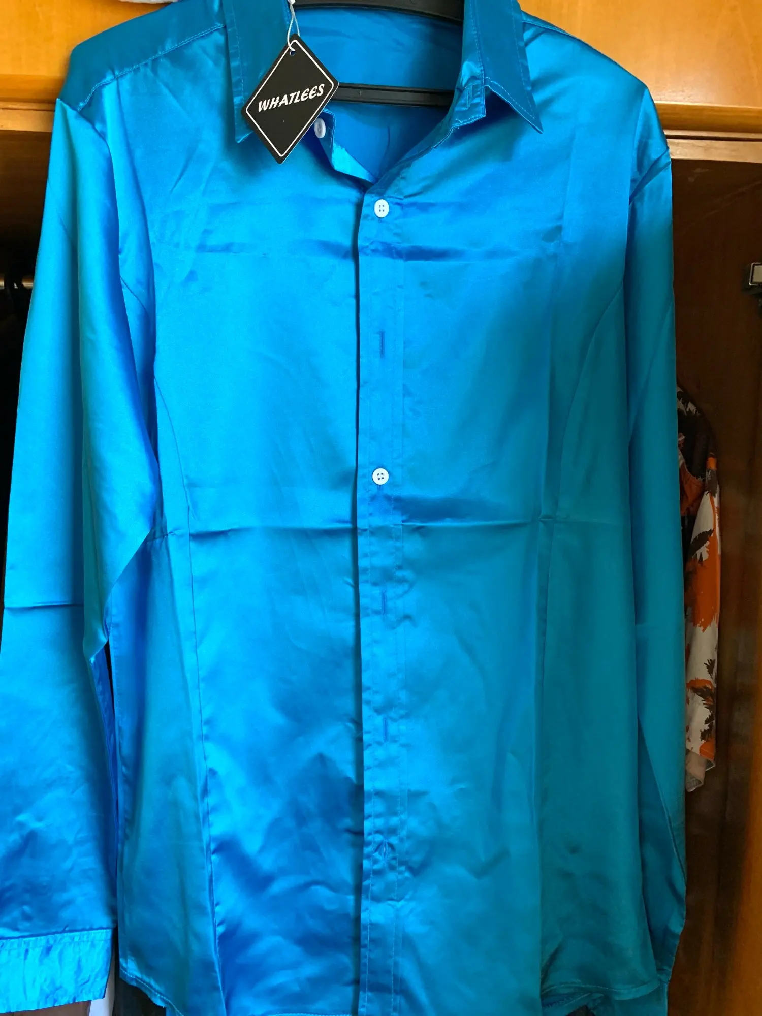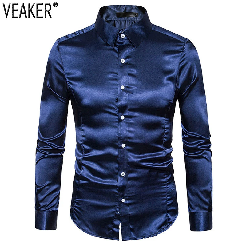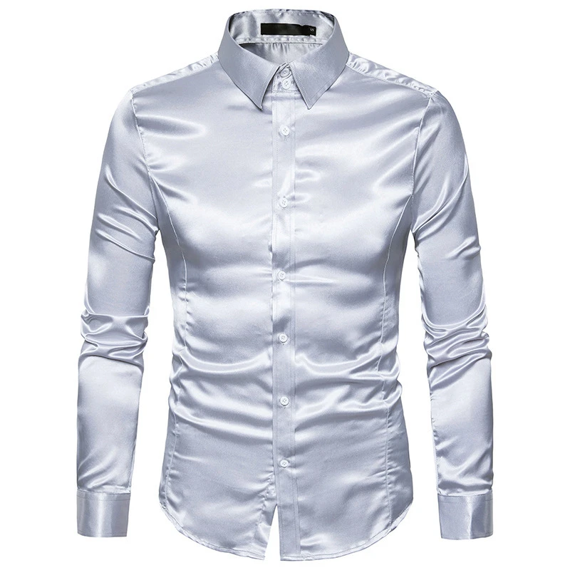 Мужская шелковая атласная вечерняя рубашка, приталенная блуза с длинными рукавами, однотонная блестящая рубашка для ночного клуба и свадьбы, 10 цветов, s S-2XL, 2021