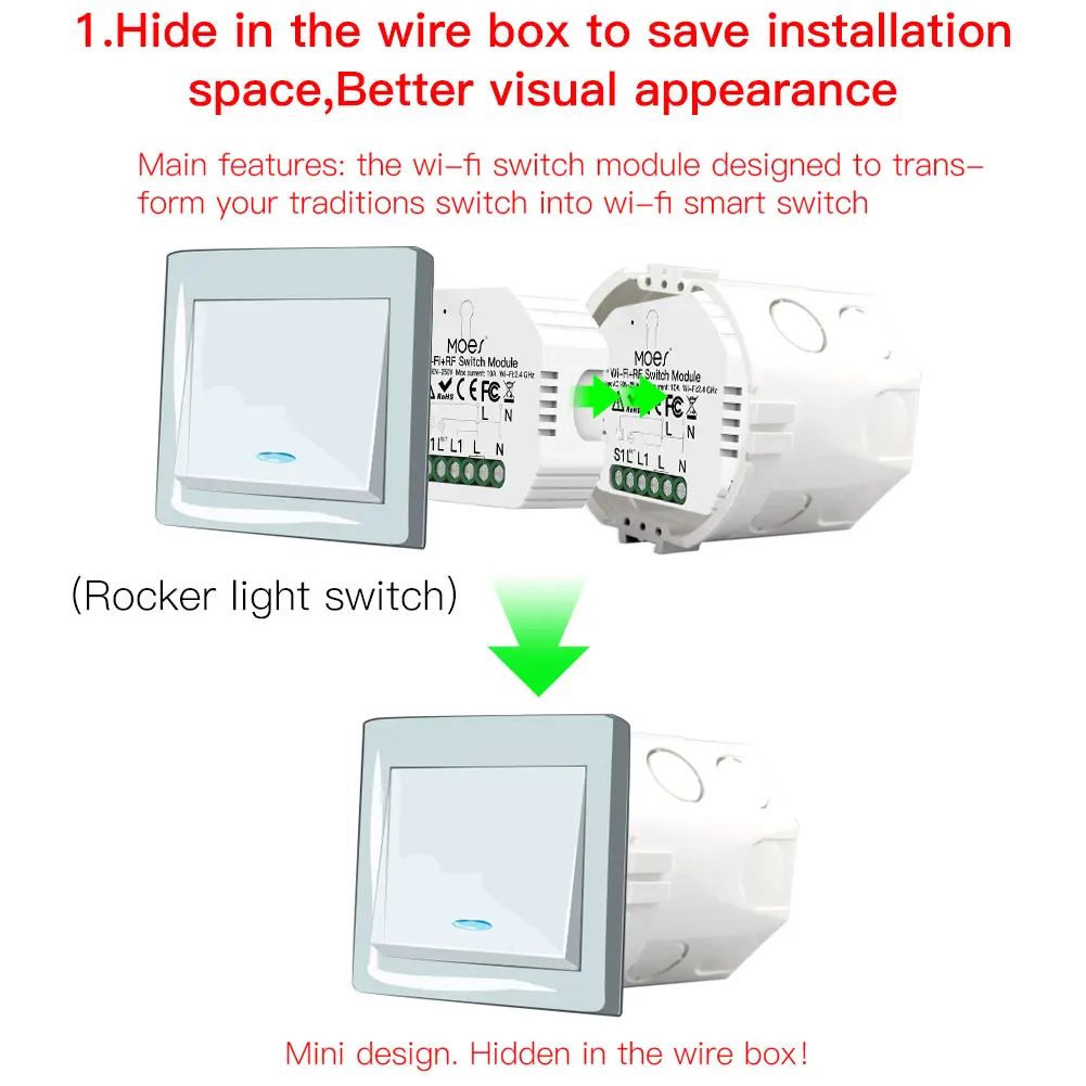 1. Этот умный Wi-Fi модуль с мини-дизайном подходит для ЕС/настенный переключатель стандарта Великобритании коробки, и легко спрятать его в скрытую стену переключения коробки вашего традиционного переключателя без каких-либо влияний на ваш оригинальный стиль украшения Чтобы сделать его умным, предоставляя вашим устройствам максимальную мощность включения/выключения интеллектуального макияжа и конвертируйте большинство любых совместимых продуктов в умные. Что еще более важно, ваш традиционный переключатель и этот умный модуль могут работать независимо в режиме non-interfering. (Примечание: Этот модуль подходит для перезапуска и сброса переключателя, см. Рис. 2 для получения подробной информации.)2. Отличается от традиционного обычного переключателя, этот смарт-переключатель может управляться разными способами в отдельности с лучшим значением, таким как управление приложением, сенсорное управление, голосовое управление и даже специально встроенная частота RF433 позволяет использовать другой контроль с помощью радиочастотного пульта дистанционного управления Переключение с кодировкой 1527 без помех; Достичь мульти-контроля, связываясь с другими смарт-переключателями в приложении smart Life, кроме того, его собственный модуль используется в качестве цепи 1/2 (2 переключателя управляют 1 светильник).(Примечание: 433 RF пульт дистанционного управления не входит в посылка, пожалуйста, приобретайте отдельно.)3. Позволяет осуществлять голосовое и Беспроводное дистанционное управление без рук; Совместимость с Alexa и Google Home; Удаленное управление устройствами с вашим смартфоном, даже когда вы находитесь вдали от дома; Функция отключения памяти доступна.4. Возьмите полный контроль за подключенными приборами с таймером, расписанием и обратным отсчетом (1/5/30 минут, 1 час и т. д.) с приложением; Поделитесь контролем с семьей и друзьями для дополнительного удобства5. Управляйте своим смартфоном через приложение smart Life/Tuya без отдельного концентратора; Гораздо более легкий режим сопряжения для добавления устройства с подключением Wi-Fi и Bluetooth; включает в себя полную 2-годовая гарантия и 60 дней гарантия возврата денег для полного удовлетворения.