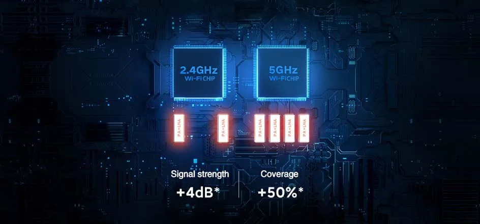 Полосы частот 2,4 ГГц и 5 ГГц оснащены независимыми усилителями сигнала (PA + LNA), что может эффективно увеличить мощность передачи сигнала и в то же время улучшить чувствительность приема сигнала, теоретическая сила покрытия сигнала увеличена на 50% *, благодаря чему стена может эффективно проникать.