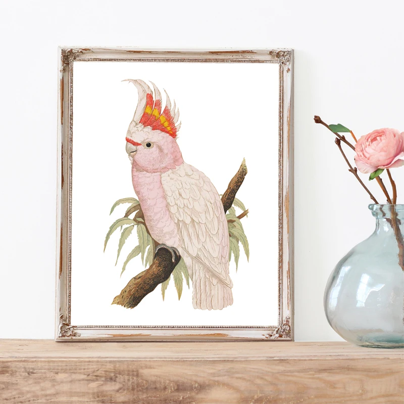 Постер какакаду с розовыми коронами, винтажный акварельный принт с ...