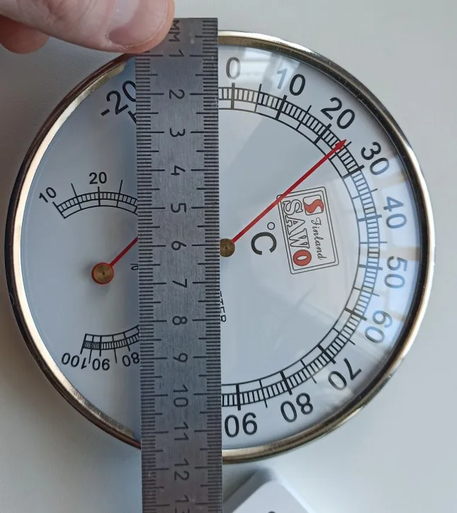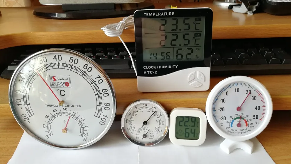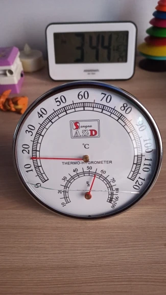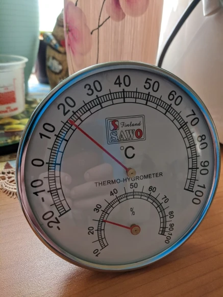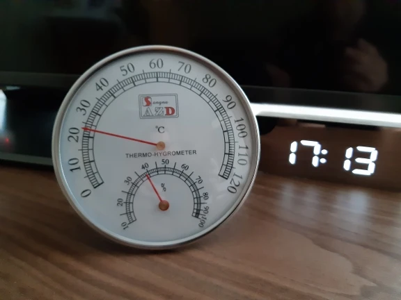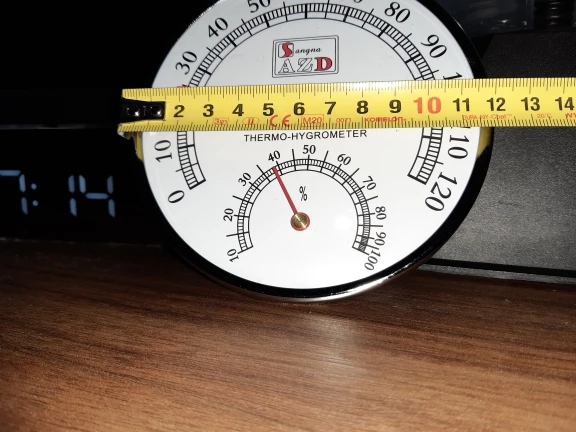 термометр с гигрометром. цифры довольно крупные контрастные. пригодиться в бане) на обратной стороне есть возможность для настройки колибровки обоих датчиков. сравнить с чем то очень точным нет возможности. показания отличались на 2 деления от электронного прибора ксиоми и ещё одного домашнего. настроил по ним.