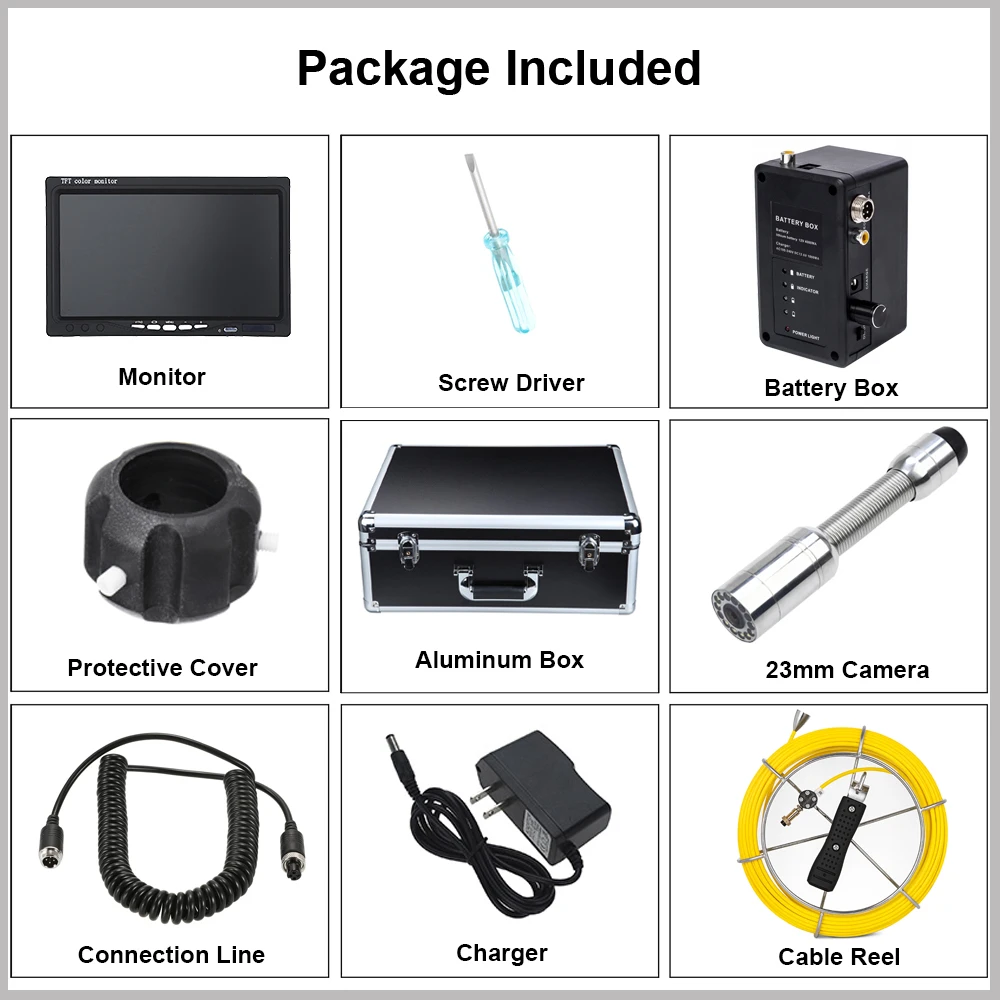 Посылка включает в себя посылку ●1 x камера1 x Монитор1 х соединительная линия1 х кабельЗарядное устройство-1 шт.Аккумулятор 4500 мАч-1 шт.1 х Отвертка1 xAluminumCase