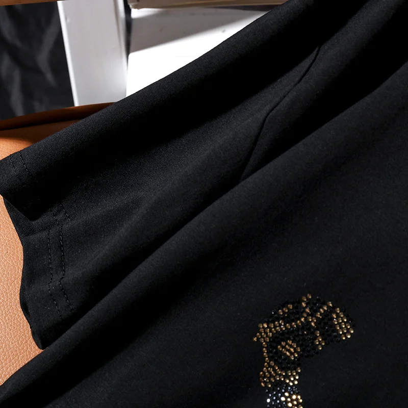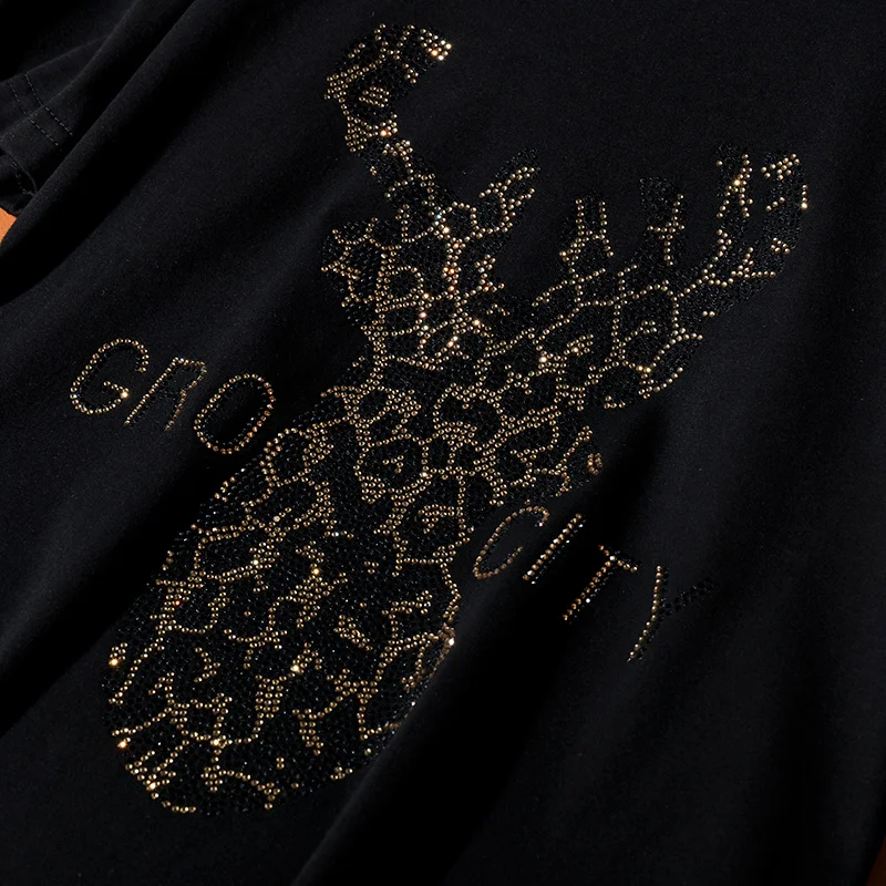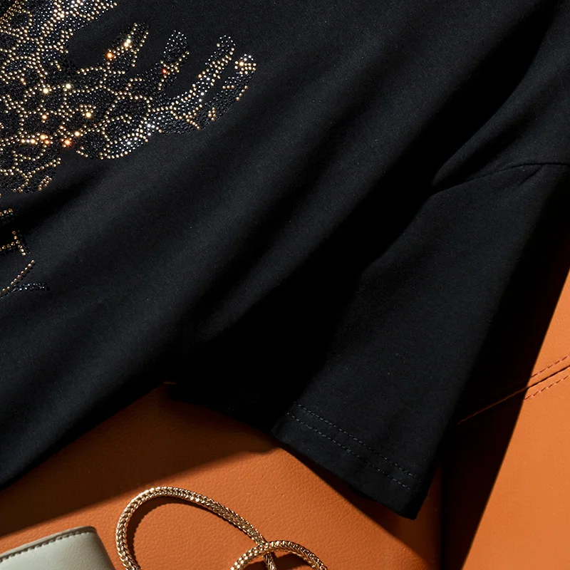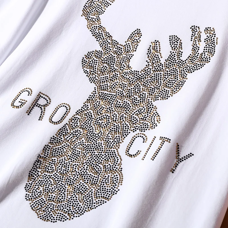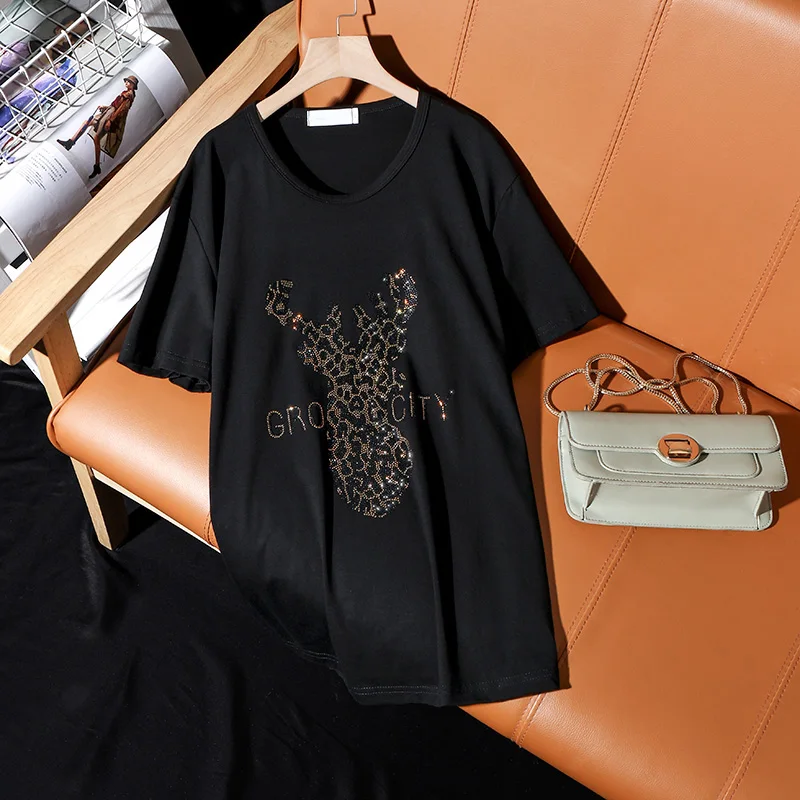 Летняя новая модная тенденция в европейском стиле, свободная футболка с короткими рукавами для женщин, повседневная, олень, + буквенный узор, женские топы с горячими бриллиантами