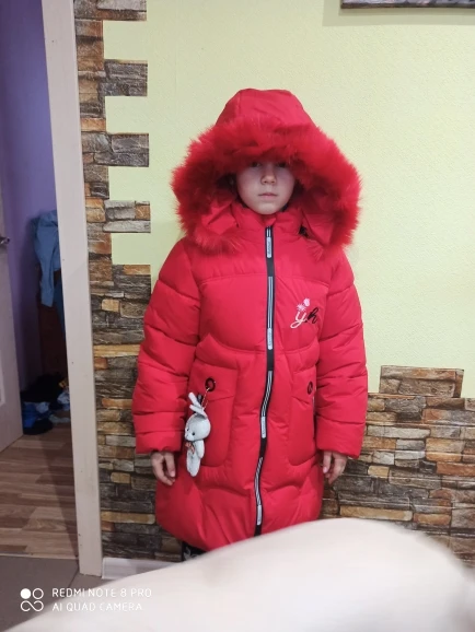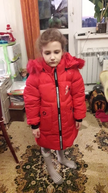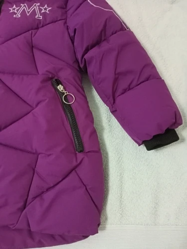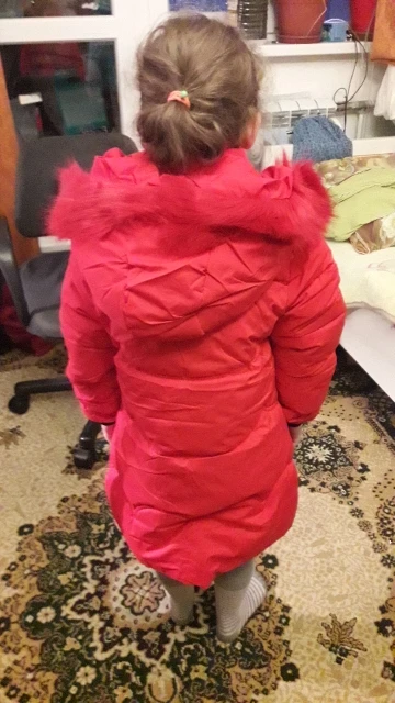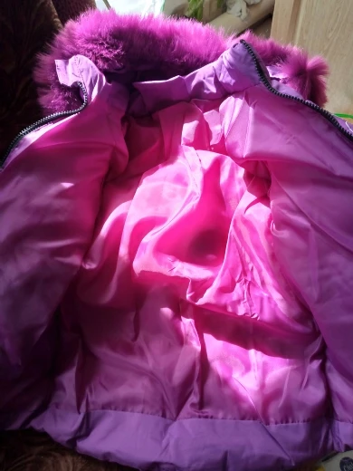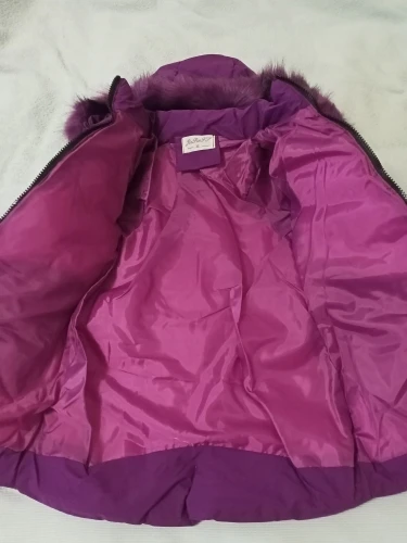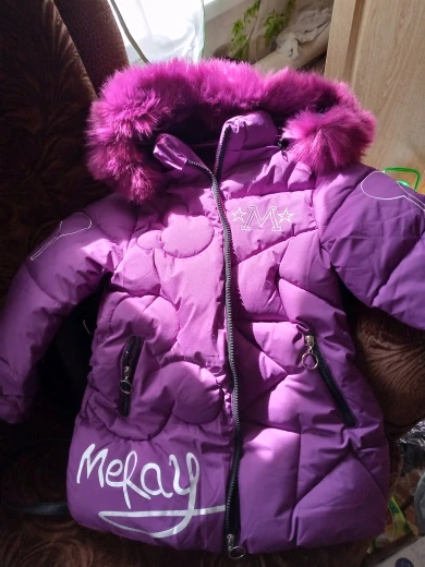 Отличная зимняя куртка! Пошита качественно, мех густой и красивый, цвет тёмно-фиолетовый. Два кармана на молнии, капюшон отстегивается. Вполне подойдёт на зиму. На фото ребенку 3,8 г., рост 102 см. Куртка чуть велика, зимой будем носить. Продавцу большое спасибо.