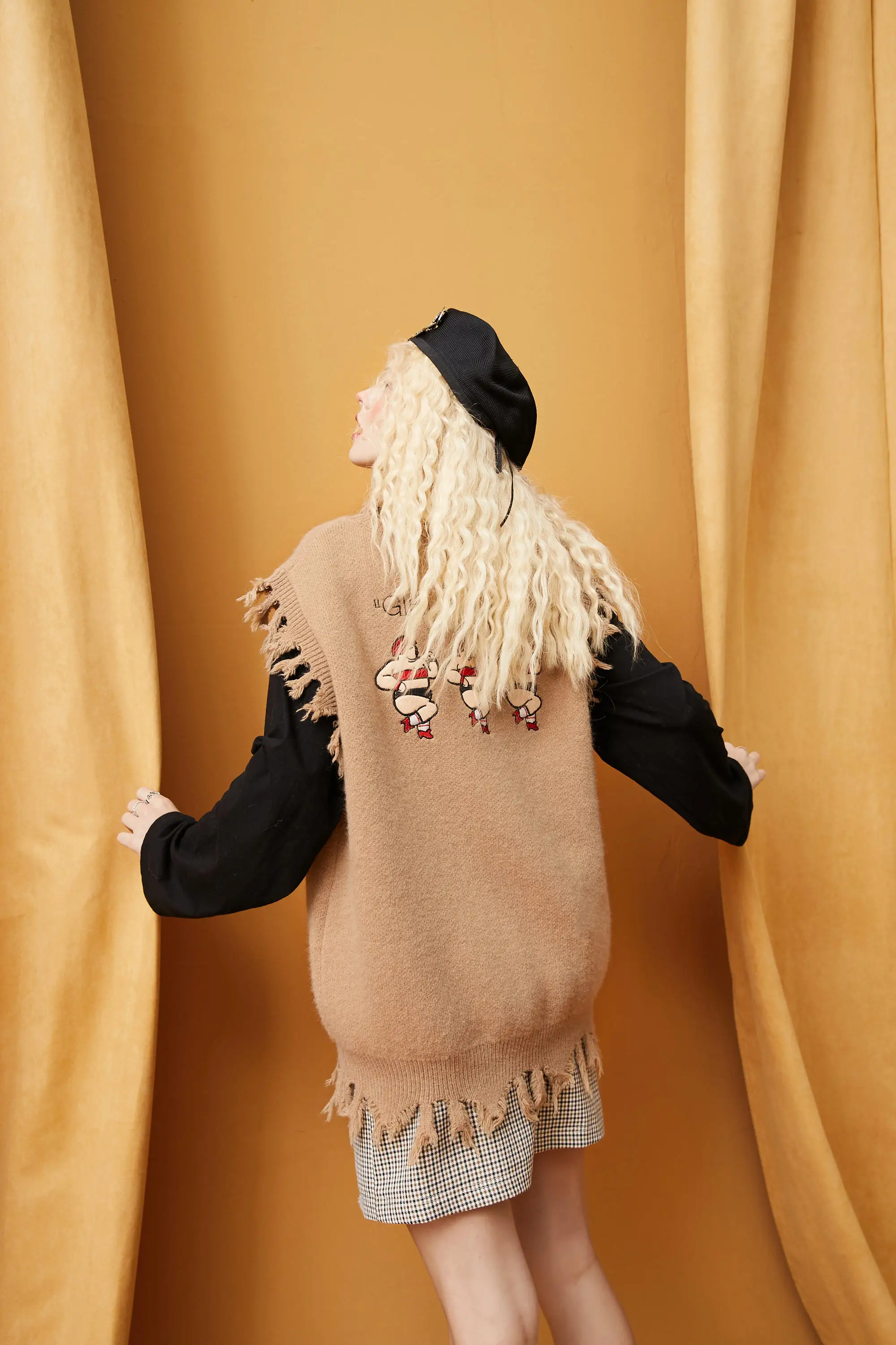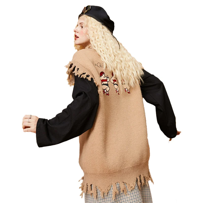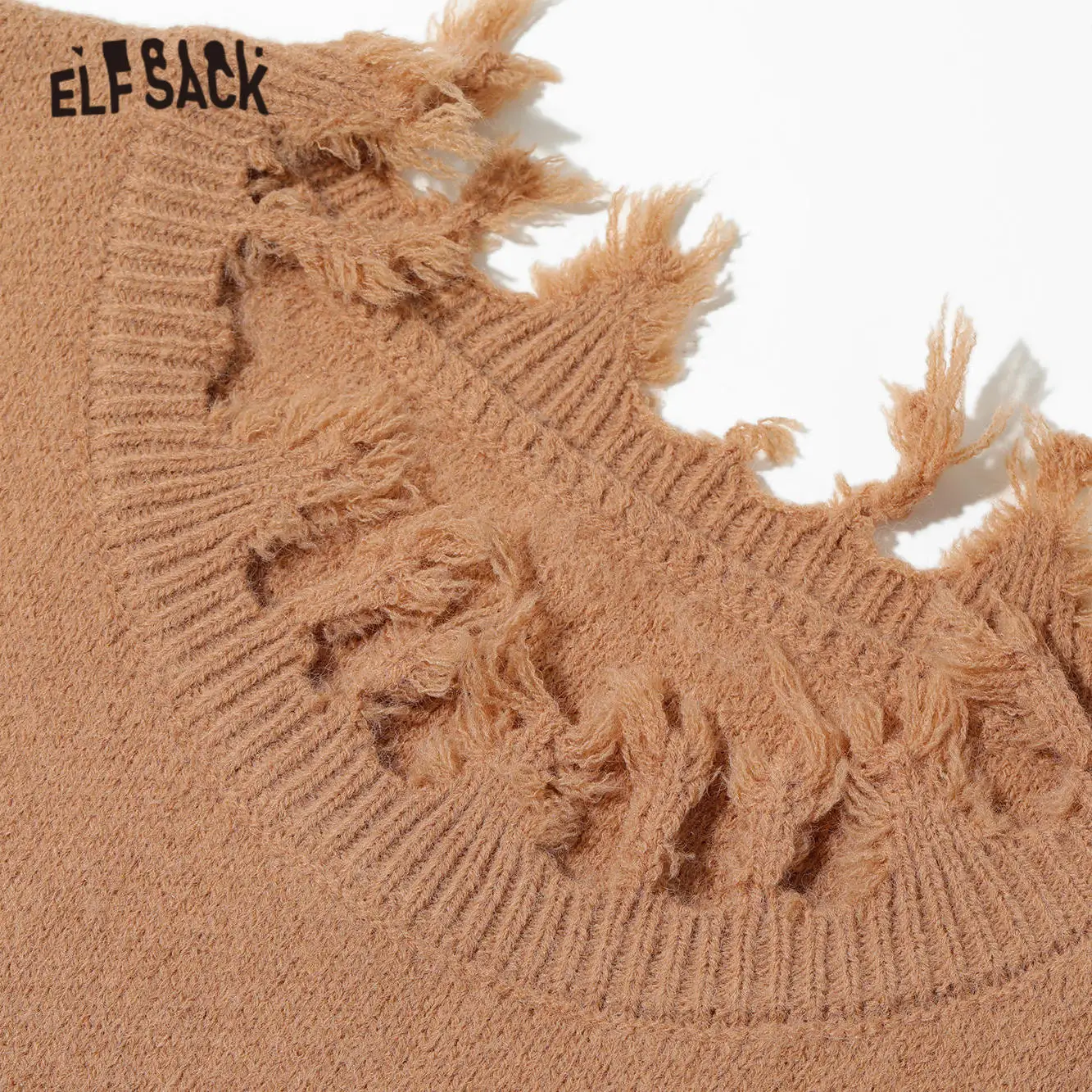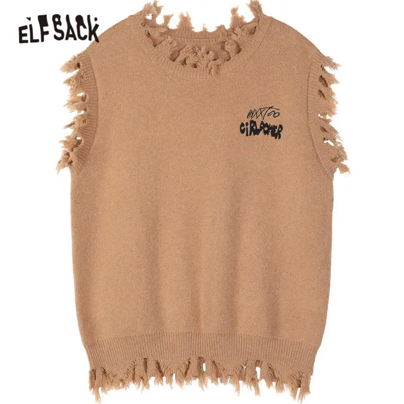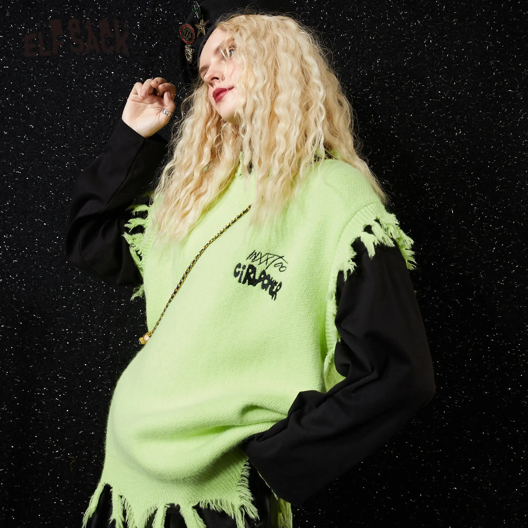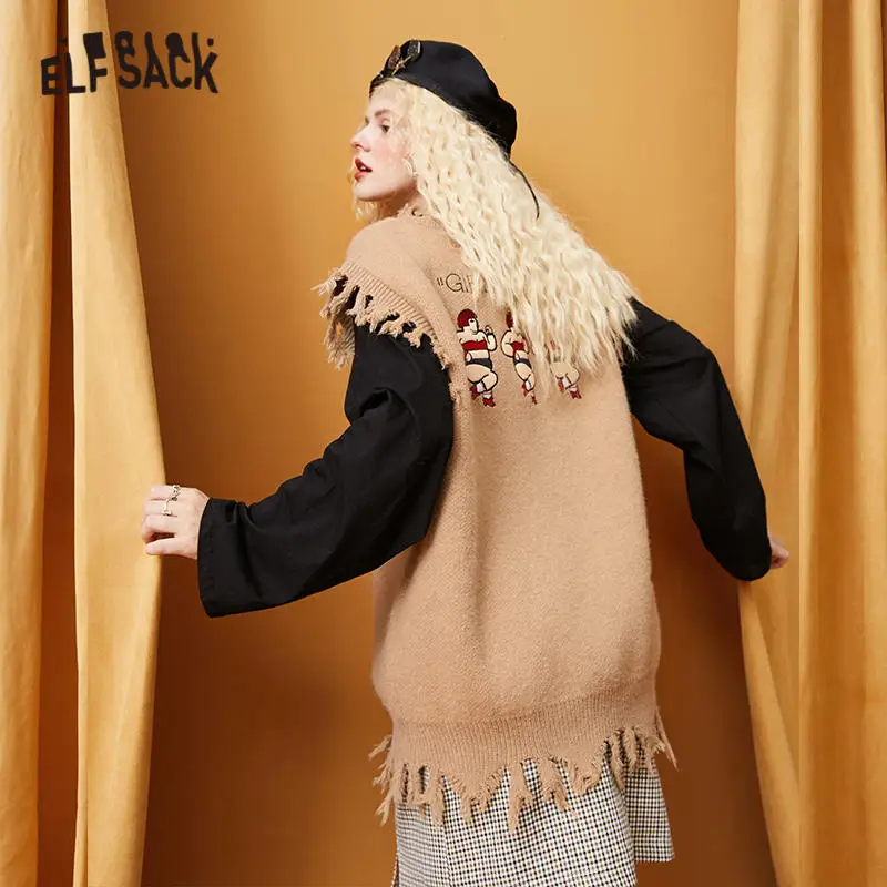 ELFSACKПовседневный трикотажный Женский пуловер с графической вышивкой, свитер, жилет, осень 2020, винтажный Женский Повседневный Топ с кисточками в Корейском стиле