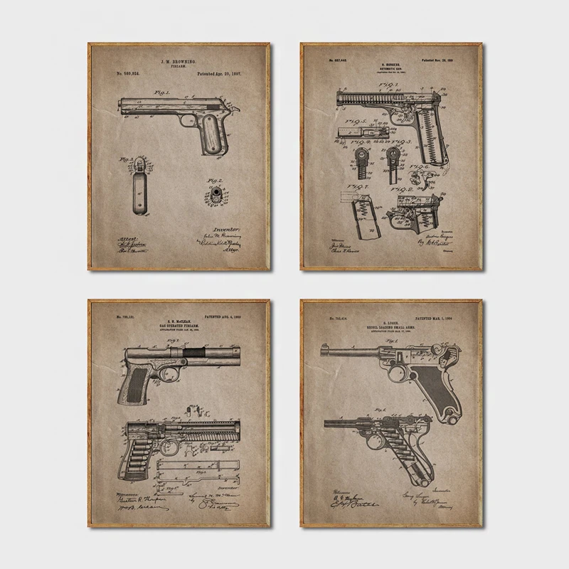 Пистолетный патентный плакат с автоматической печатью, Luger винтажный пистолет, Картина на холсте, военное художественное украшение на стену
