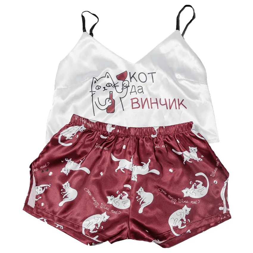 Пикантная Шелковая пижама из двух частей, женская пижама без рукавов, Милая женская пижама с котом и V-образным вырезом, шорты, одежда для отдыха, пижамный комплект, атласная пижама