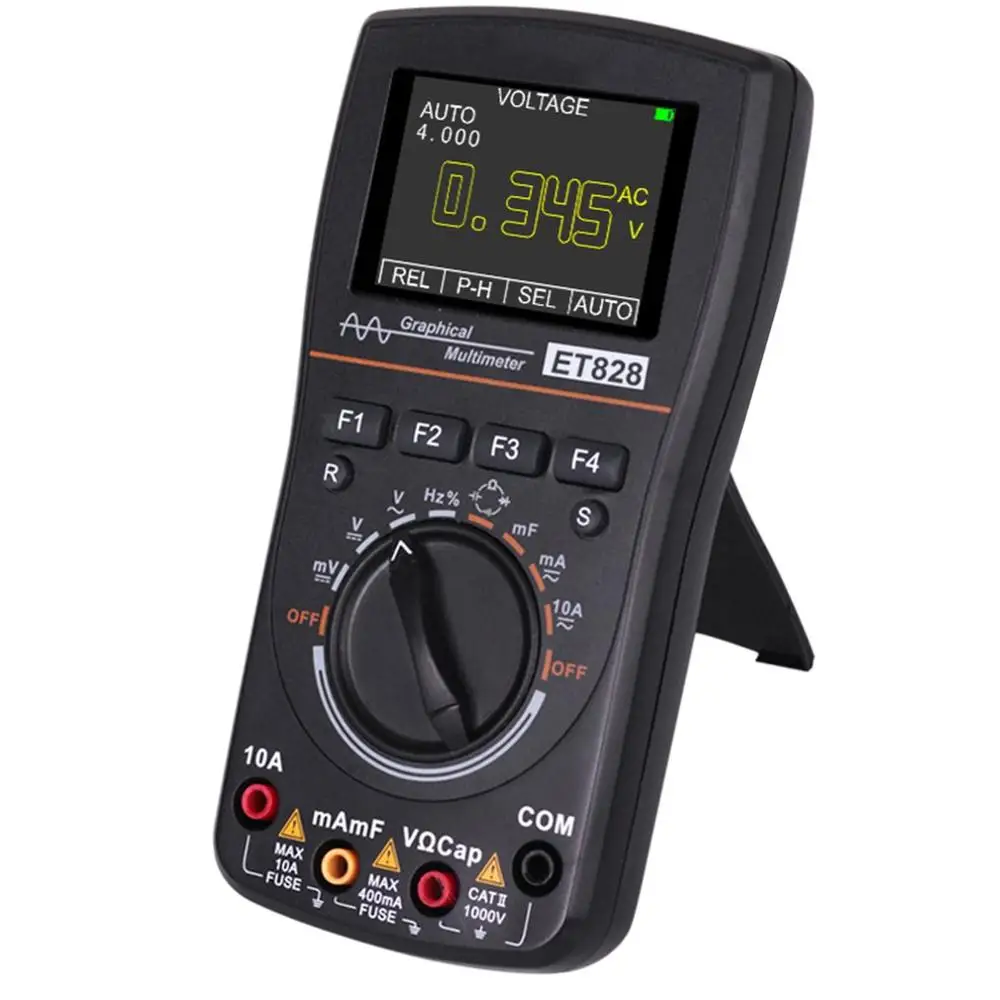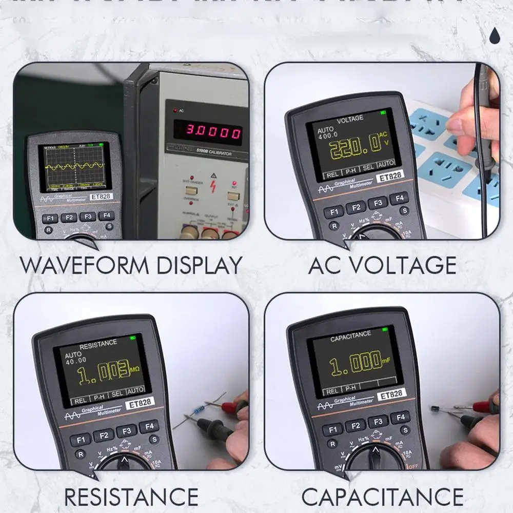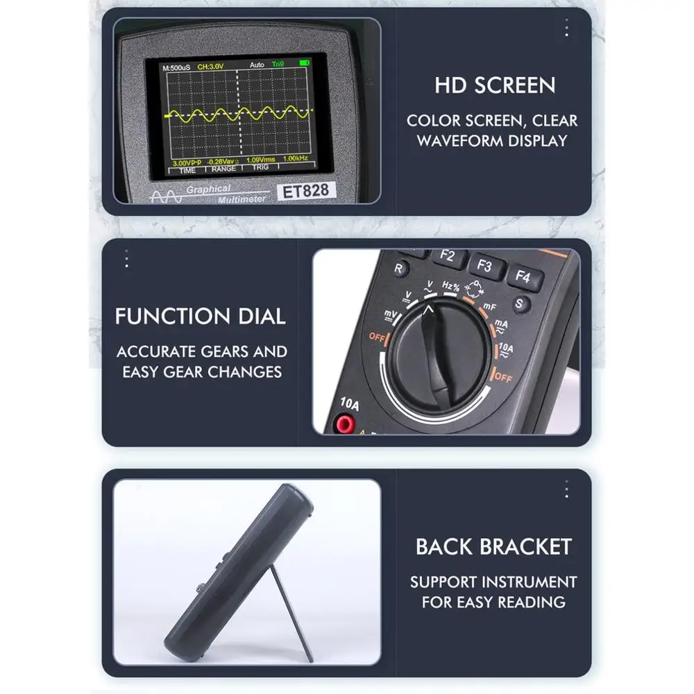 Модель: ET828 Тип изделия: мультиметр осциллографа Материал: пластик Цвет: черный Дисплей: 320x240, белая подсветка Батарея: 3 шт. х АА батареи (не входят в комплект) Хранение: 100 данных/10 сигналов Хранение: -10 °C 〜 + 60 °C; <90% относительной влажности Использование: 0 °C - + 40 °C; <75% RH Полоса пропускания: ACV/1 МГц Предохранитель Технические характеристики: 500mA/250V, 10A/250V Время использования: более 10 часов Максимальная частота дискретизации в реальном времени: 2,5 Мбит/с DC Напряжение: 400мв/4В/40В/400/1000V AC Напряжение: 400мв/4В/40В/400/750V Ток постоянного тока: 40мА/400мА/4А/10А Переменный ток: 40мА/400мА/4А/10А Сопротивление: 400.0Ω ~ 40.00MΩ Емкость: 51.2nF ~ 100 мкФ, 10.00mF Частота: 5 Гц ~ 5 МГц Рабочий цикл: 0.1% ~ 99.9% Диодный тест: напряжение около 5 В, тестовый ток около 1,5 мА Тест на непрерывность: сопротивление суждения около <50 Ом, звуковой сигнал Цвет Экран: около 2,4 дюйм (ов) Размер: около 83x160x32 мм