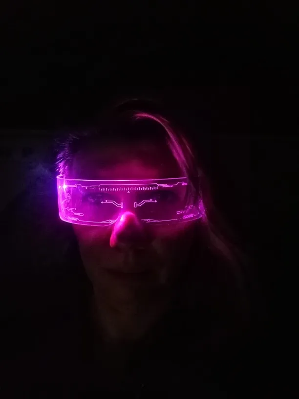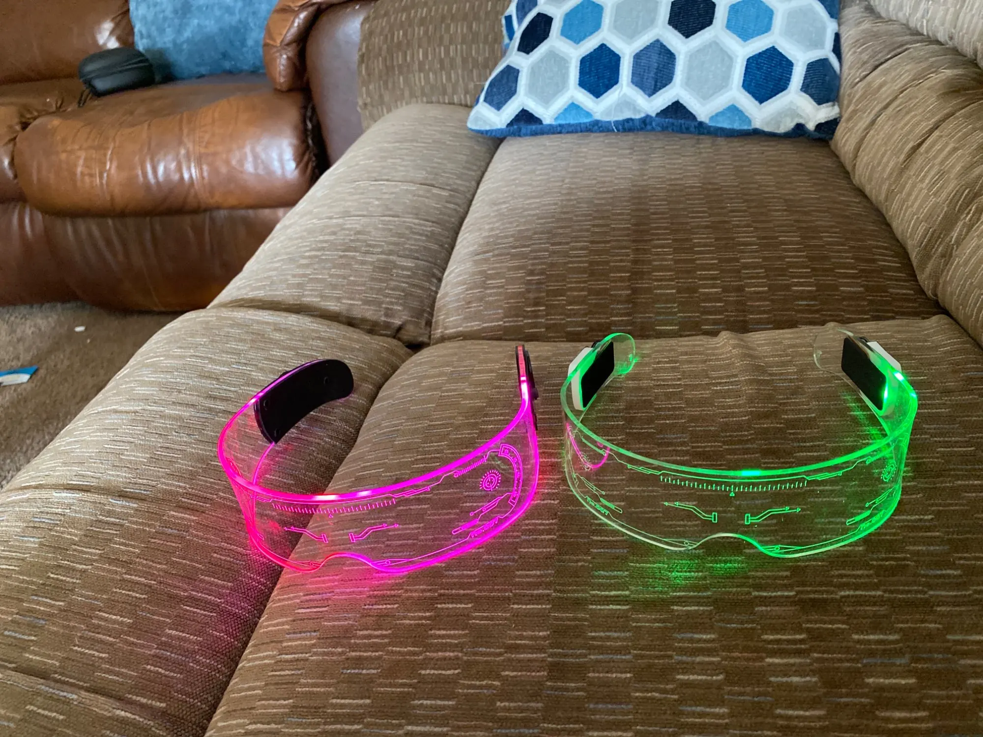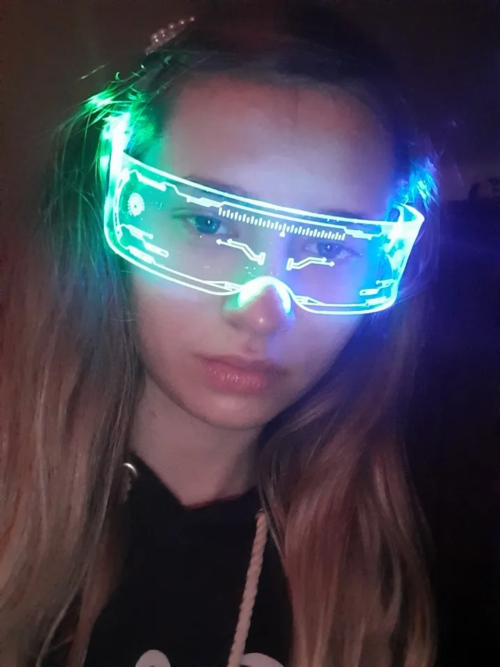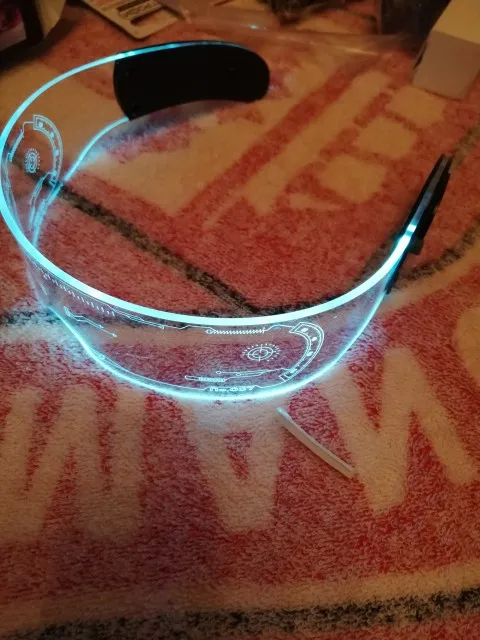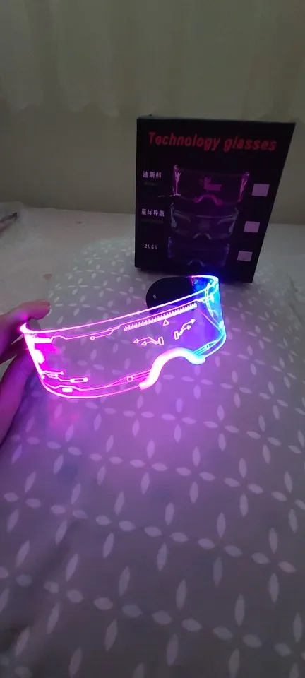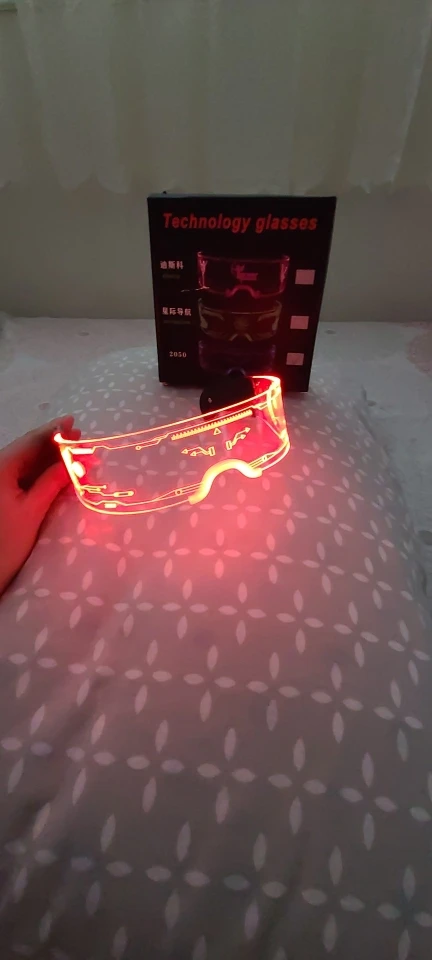 Очки приехали быстро. Была помята коробка, но качество очков - супер! Выглядят очень круто! Есть два отделения для батареек. Очки светятся очень ярко, можно переключить на разные режимы. Покупкой довольна, спасибо!!!