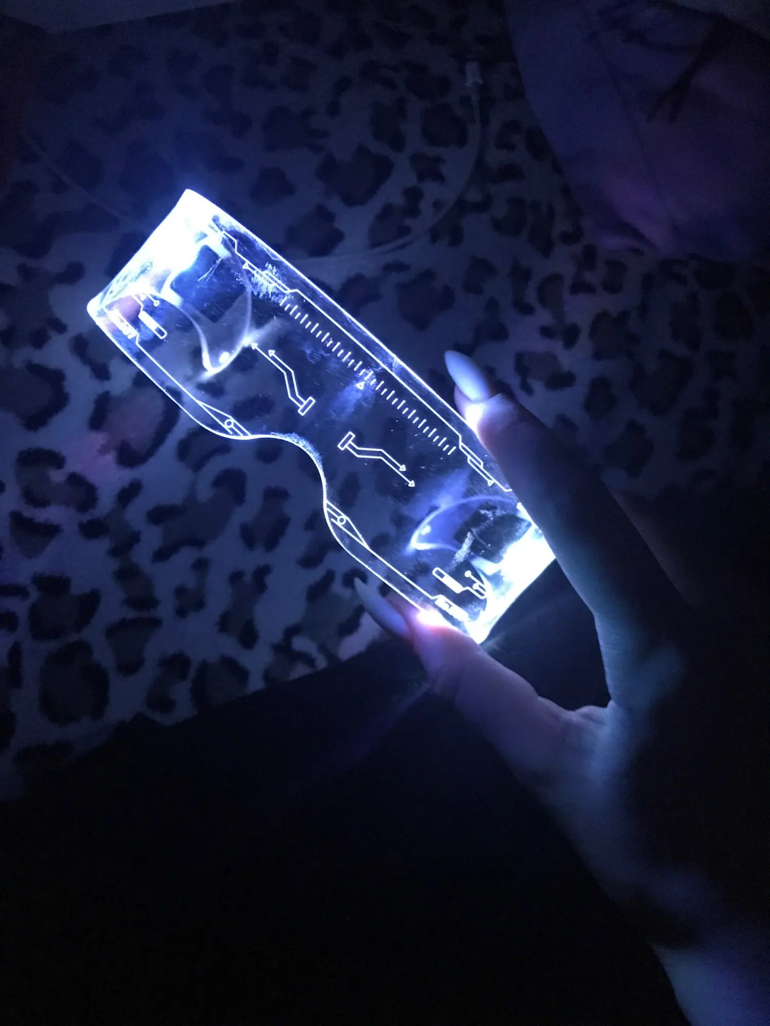 Очки шли чуть больше месяца. Упакованы хорошо, но коробка была ужасно помятой. Очки целые. На них есть защитная плёнка, которая кстати довольно трудно снимается. В комплекте нет батареек, так что советую купить сразу.(нужны CR 2032, 2 штуки) Очки крутые у них есть две кнопки с каждой из сторон которые позволяют переключать половину подсветки, а так же менять режим, из-за чего можно делать крутые комбинации с цветом.