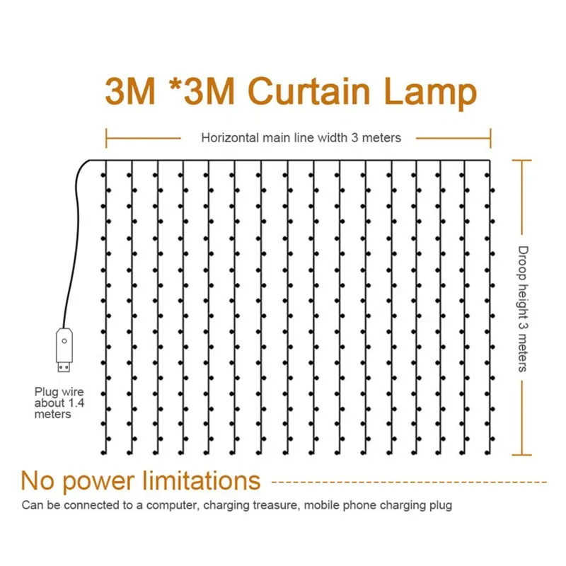 USB светодиодный светильник для занавесокМатериал: пластик + серебряная медная проволокаРазмер: ширина: 3 м * Высота: 3 м с 300 светодиодамиШирина: 3 м * высота: 2 м с 200 светодиодамиШирина: 3 м * высота: 1 м со 100 светодиодамиВодонепроницаемость: IP45Срок службы: 50000 часовПереключатель 8 режимов: на USB или пульте дистанционного управленияС пультом дистанционного управления: Да Посылка:1 шт. светодиодный светильник для штор1 шт. пульт дистанционного управления (аккумулятор в комплект не входит)