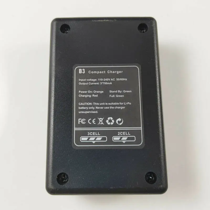 100 новый бренд! Входное напряжение: 100 - 240 в AC50 / 60 Гц Выходной ток: 3*800 мА Подходит для 2 и 3 батарей Li-Po Светодиодный индикатор: При включении питания: оранжевый Режим ожидания: зеленый Батарея зарядки: красный Батарея полный: зеленый ImaxRC B3 PRO Введение: С развитием электрической технологии, у нас есть новый дизайн легкого компактного зарядного устройства для 2 и 3 ячеек LiPo батареи быстрой зарядки с широким входом переменного тока. Встроенный внутренний выключатель переменного тока мощностью 100-240 в, а цепь балансировки высокой точности может поставлять больший ток до 850мА на ячейку. Светодиодный дисплей двойного цвета может отображать процесс зарядки (красный: зарядка; Зеленый: полный). Это зарядное устройство компактное и легкое, особенно есть отдельный соответствующий порт баланса для каждого аккумулятора. B3 PRO операция: 1. Сначала Подключите зарядное устройство B3 Pro к питанию, в то время как три светодиода питания будут переключаться с красного на зеленый, что указывает на то, что зарядное устройство работает в хорошем порядке. 2. (например, набор аккумуляторов 3s) Во-вторых, подключите аккумулятор к балансовому порту 3s, в то время как три светодиода питания будут превращаться в красный и Начинается зарядка. Пожалуйста, обратите внимание, что после того, как зарядка одной ячейки будет выполнена, соответствующий светодиодный индикатор питания будет зеленым. 3. Когда три светодиода питания все становятся зелеными, зарядка для 3S батареи завершена. ImaxRC B3 Предупреждение Правильно Подключите зарядное устройство B3 Pro к питанию и аккумулятору в соответствии с инструкцией, приведенной в руководстве пользователя. Пожалуйста, используйте это зарядное устройство под наблюдением. Пожалуйста, поместите зарядное устройство в сухую среду и держите его подальше от огня. Пожалуйста, не затягивайте и не затягивайте шнур питания или не заменяйте его, иначе возгорание/Электрический шок будут вызваны. Пожалуйста, не прикасайтесь к зарядному устройству и питанию влажными руками, иначе это вызовет Электрический шок. Чтобы продлить срок службы зарядного устройства, снимите его с питания после завершения зарядки. За детьми должны следить взрослые, чтобы использовать зарядное устройство.