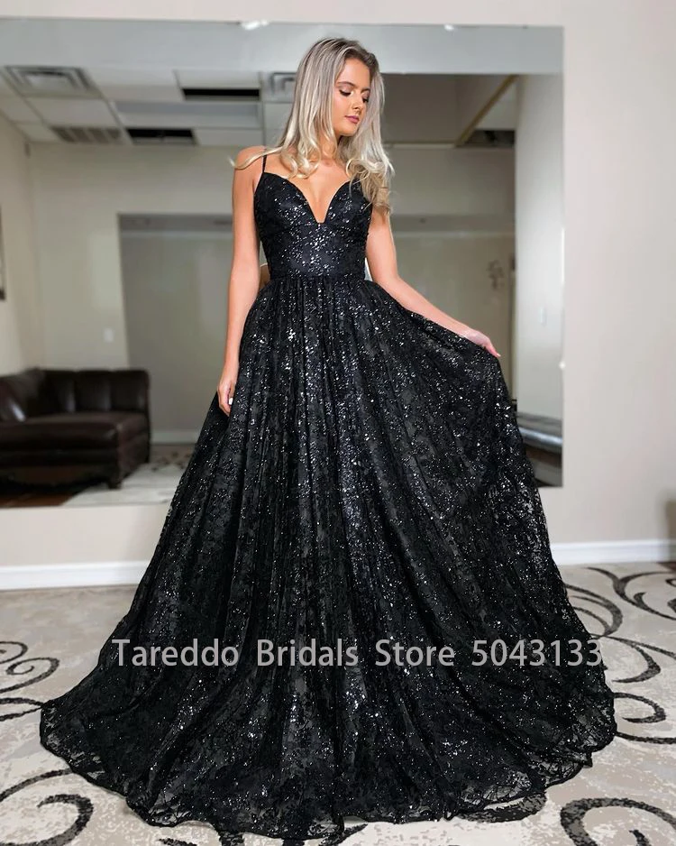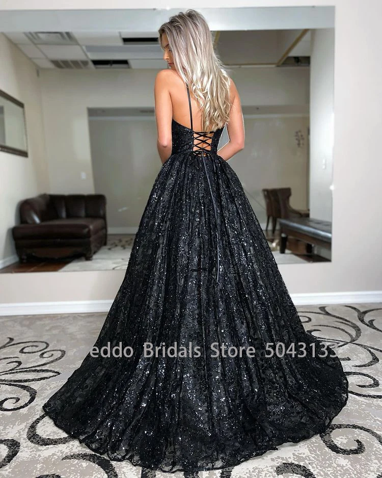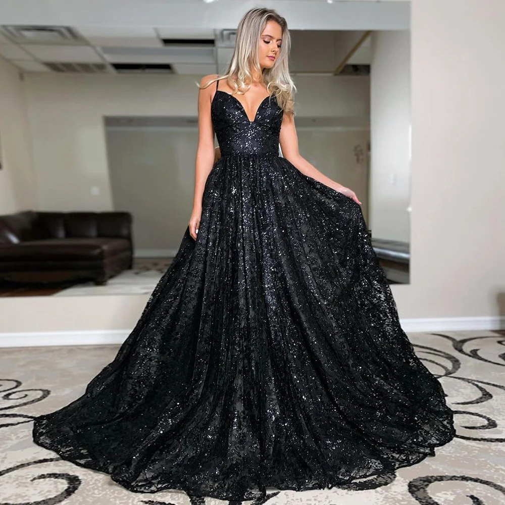 2022 блестящие черные платья для выпускного вечера, официальное кружевное блестящее ТРАПЕЦИЕВИДНОЕ ПЛАТЬЕ С V-образным вырезом и открытой спиной для вечеринки
