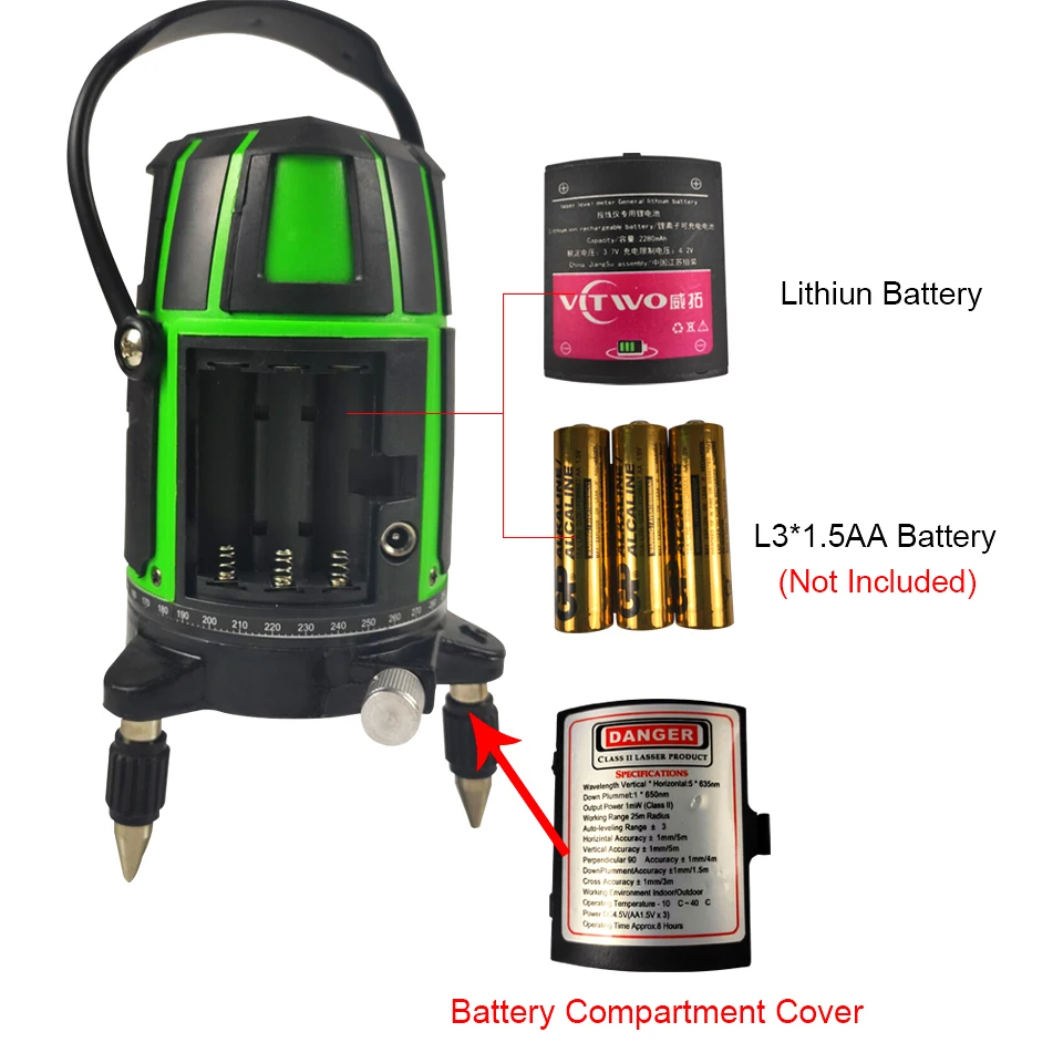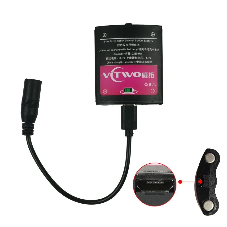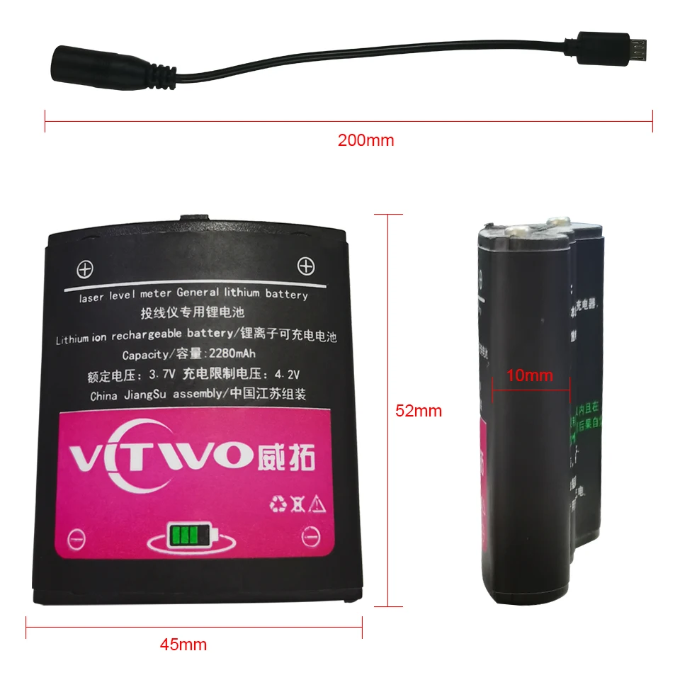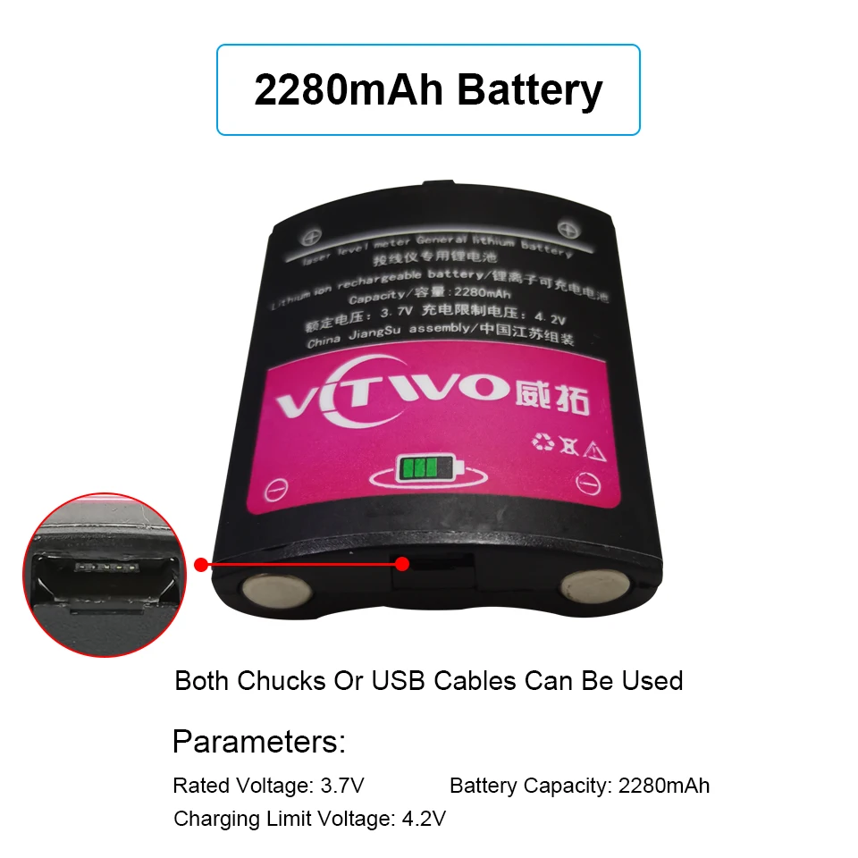 Характеристики:Тип батареи: перезаряжаемая литиевая батареяВыход напряжение: 3,7 VПрименение для 2 / 3 / 5 линий лазерный уровеньОсновная особенность:100% новый и высокое качество.Высокая плотность энергии, длительный срок службы, без памяти.Высокая емкость/литий-ионный аккумулятор с премиум-ячейкой.Защита от перегрева и защита от перезаряда.Зарядка:Когда вы поместите аккумулятор в отсек и подключите питание переменного тока, аккумуляторМожно заряжать как аккумулятор мобильного телефона или использовать зарядное устройство для зарядки аккумулятора.В целом может быть полная зарядка аккумулятора 3 - 4 часа.ПРИМЕЧАНИЯ по безопасности:Заряжайте аккумулятор перед использованием.Используйте только специальное зарядное устройство.Держите клеммы аккумулятора в чистоте.Всегда храните батарею в сухом месте.Не замыкайте аккумулятор.Не разбирайте аккумулятор.