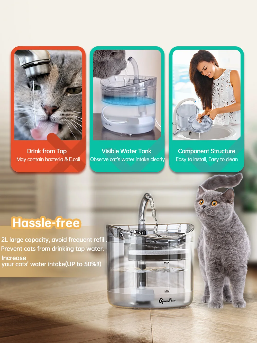 Downypaps 2L автоматический фонтан для кошек с водопроводом для собак, прозрачный фильтр, поилка для животных, датчик питья