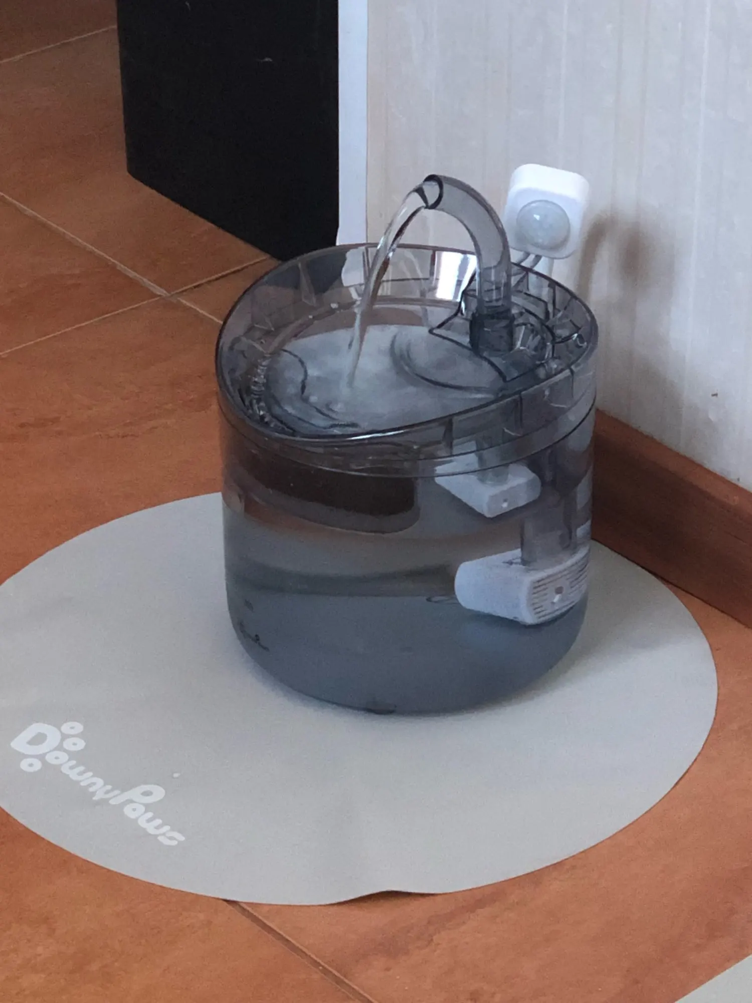 Фонтан хороший, почти бесшумный, добротный, не пахнет, выглядит хорошо. Датчик очень чувствительный, думали, не работает, но ему просто надо найти положение с меньшим радиусом охвата. Когда в радиусе метра никого нет, выключает мотор исправно. Единственная проблема - собственно, кот. Пока интереса к чуду техники не проявил, но он вообще у нас плохо пьёт. Надежды не теряю.