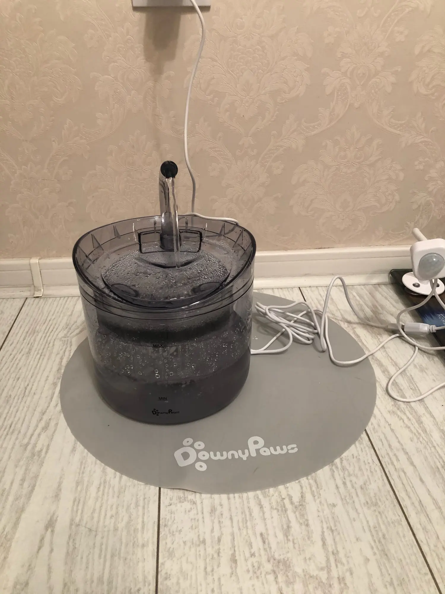 Поилка супер, кошка в восторге! Стала больше пить и часто сидит залипает на текучую воду. Журчит очень тихо, почти незаметно. Советую брать с датчиком движения. Кабель USB, вилка в комплекте.