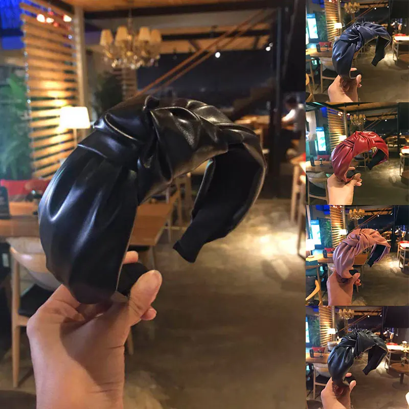 Широкий обруч с боковой головкой, винтажные кожаные аксессуары для волос, обруч с бантиком и узлом для волос, однотонный обруч из искусственной кожи