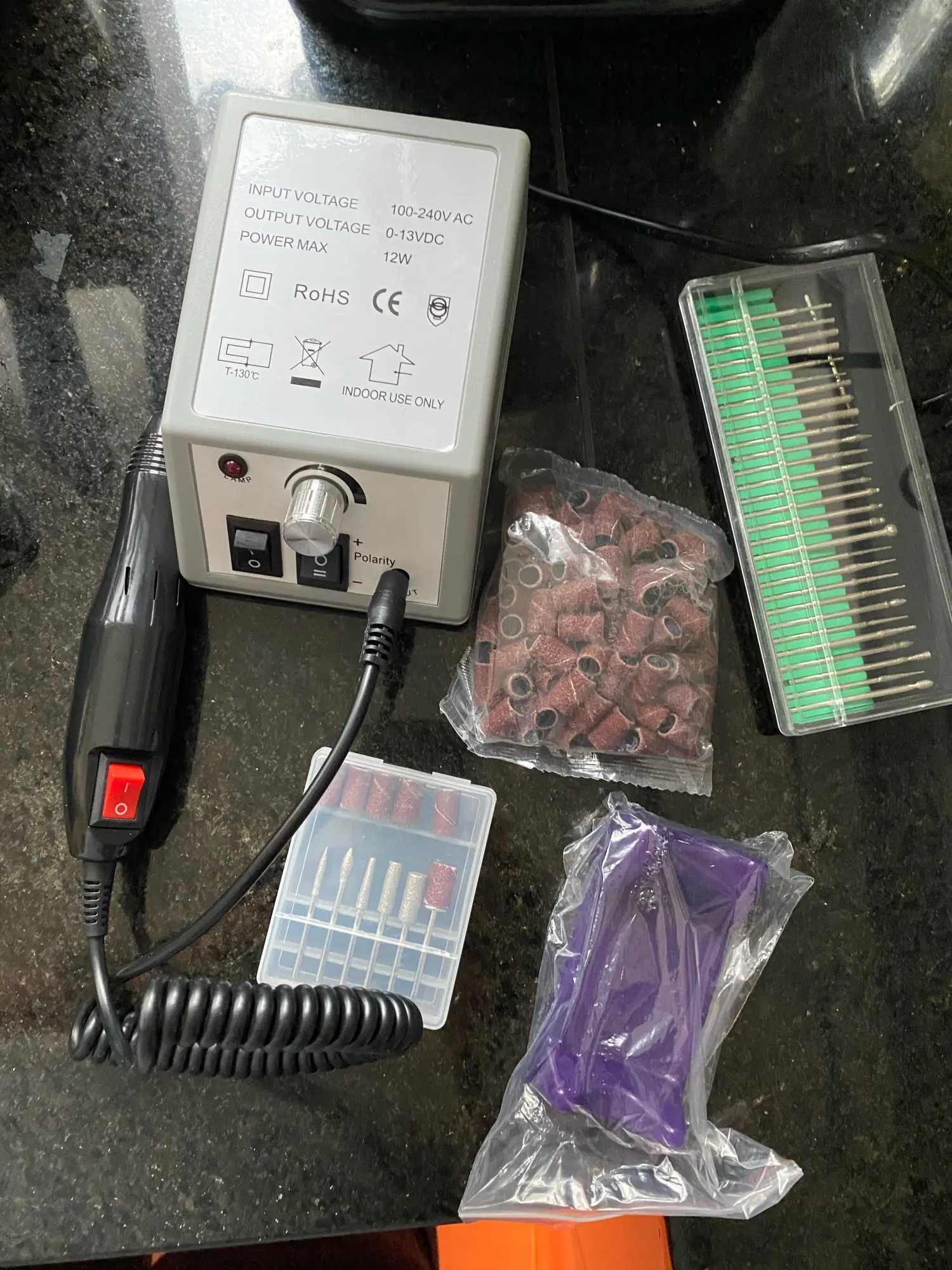 очень быстро доставили за неделю в пункт выдачи. все работает. скорость хорошая, кутикулу счищает. громкий. одна насадка не входит в аппарат, но нестрашно. насадки надо вставлять с усилием