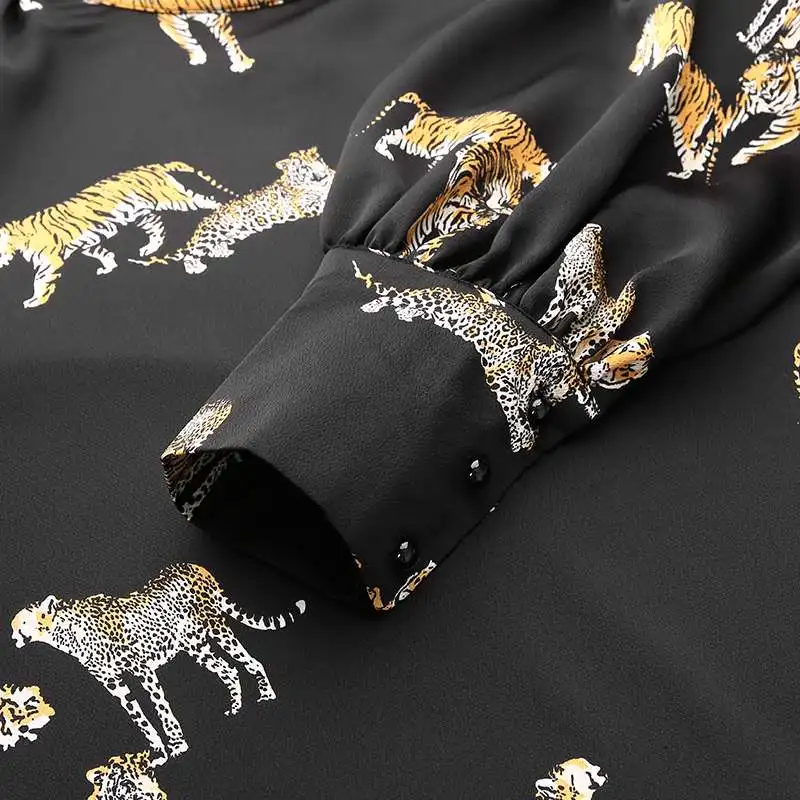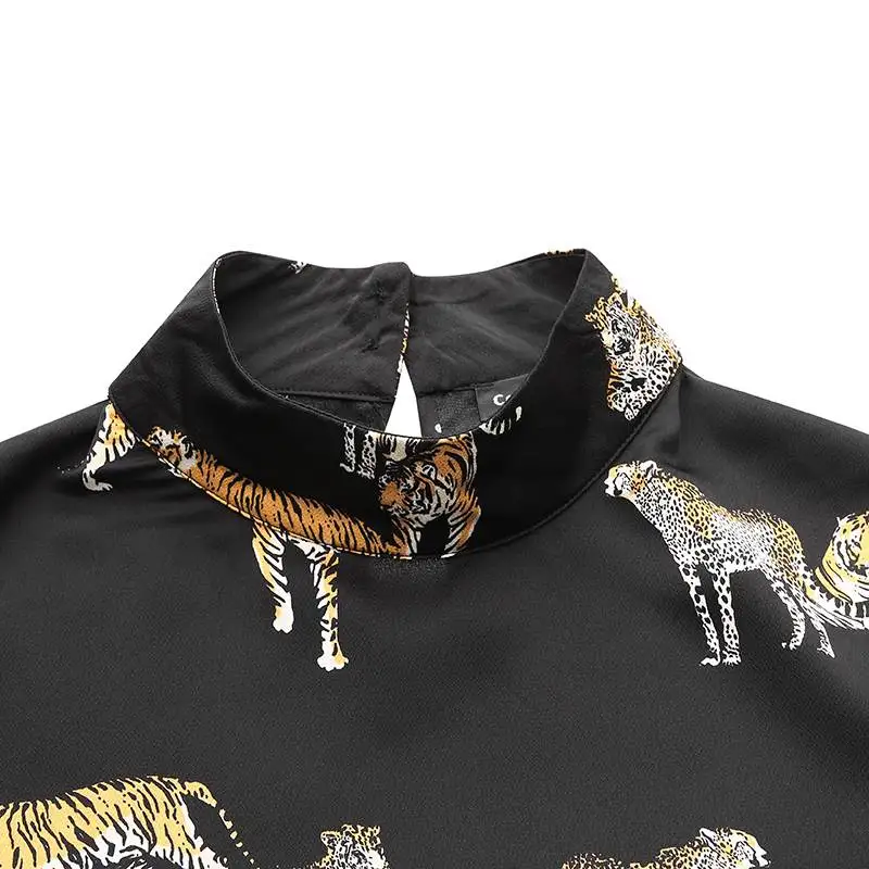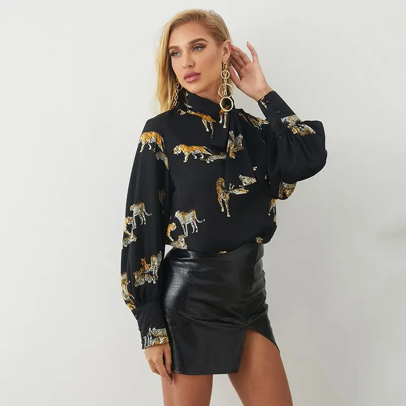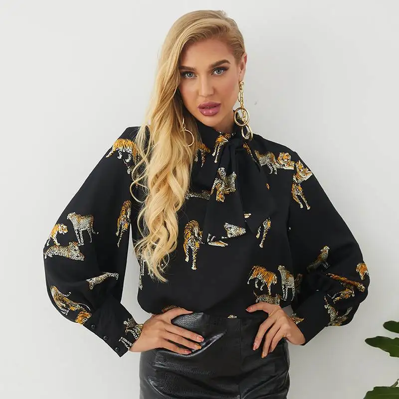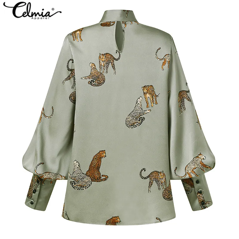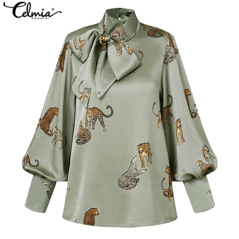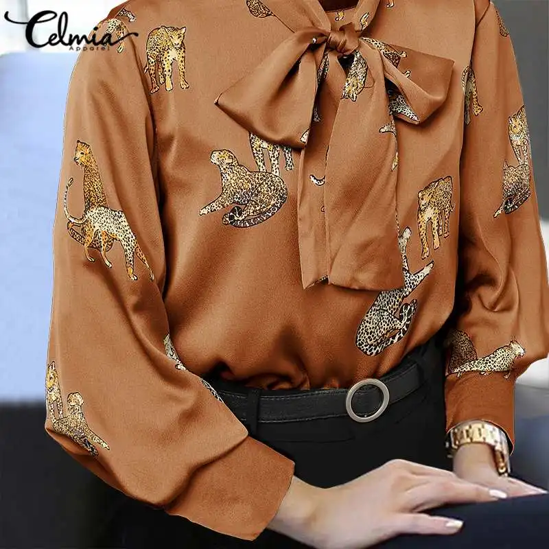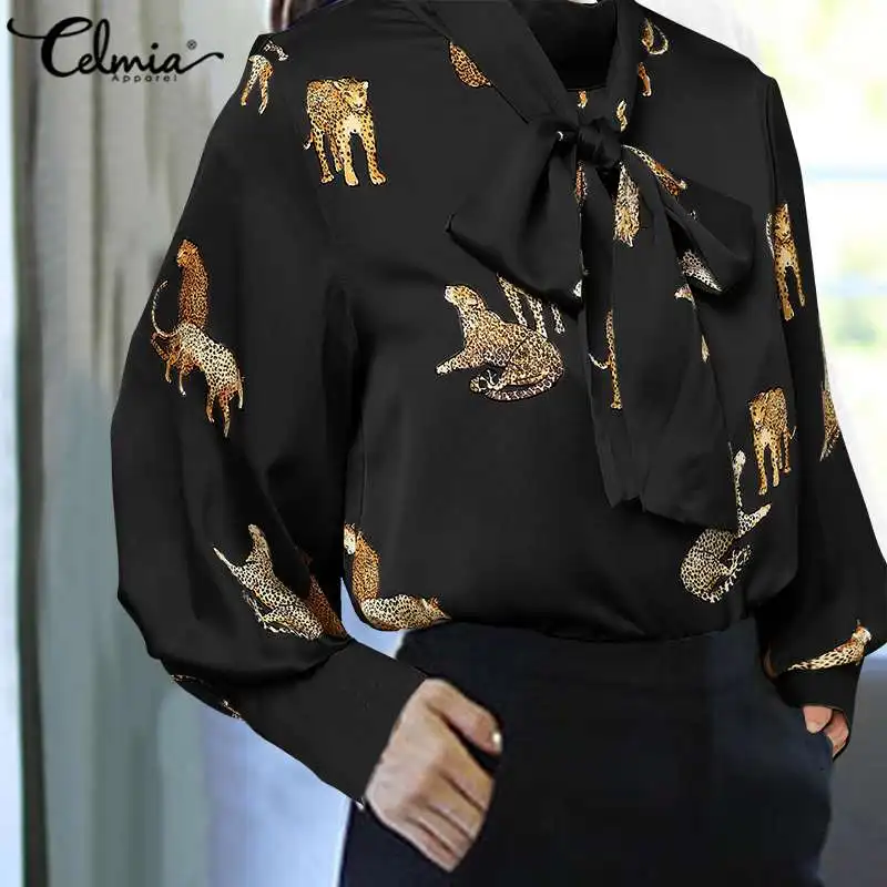 Женский Длинный фонарь рукав блузки Celmia, элегантная обувь, украшенная бантиком, рубашки для мальчиков с принтом в виде тигра вечерние топы 2021 на осень зиму Высокий воротник топ размера плюс 7