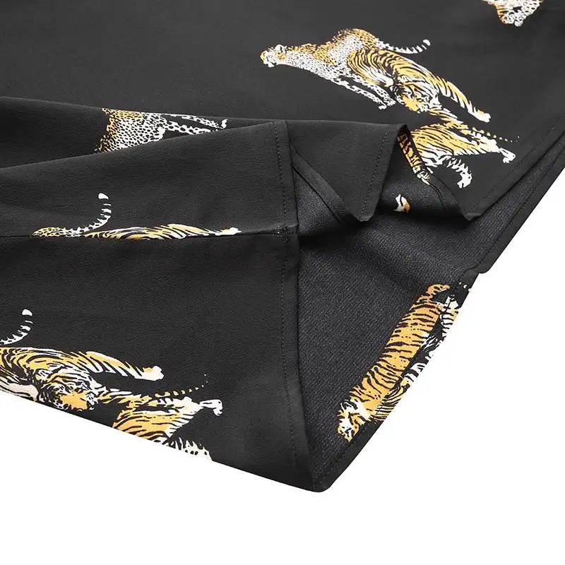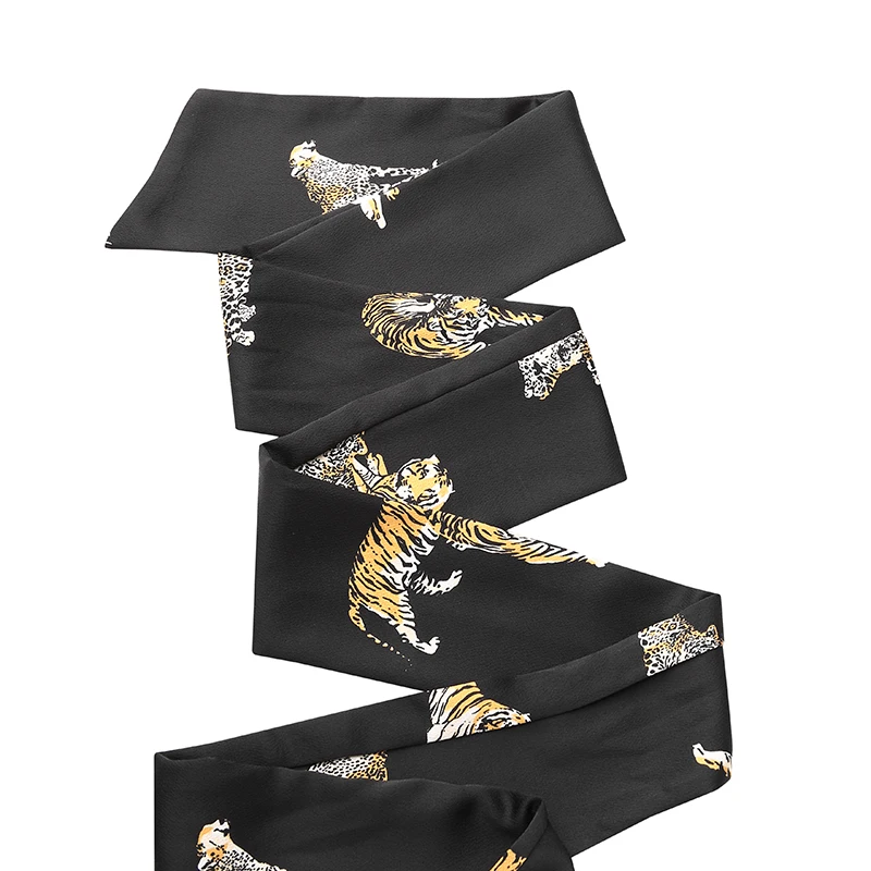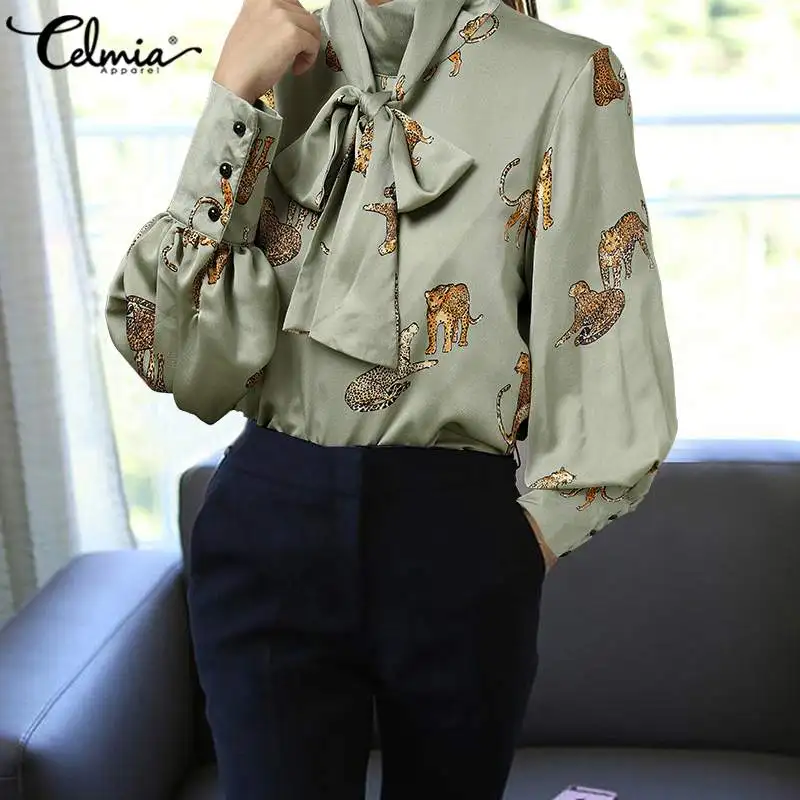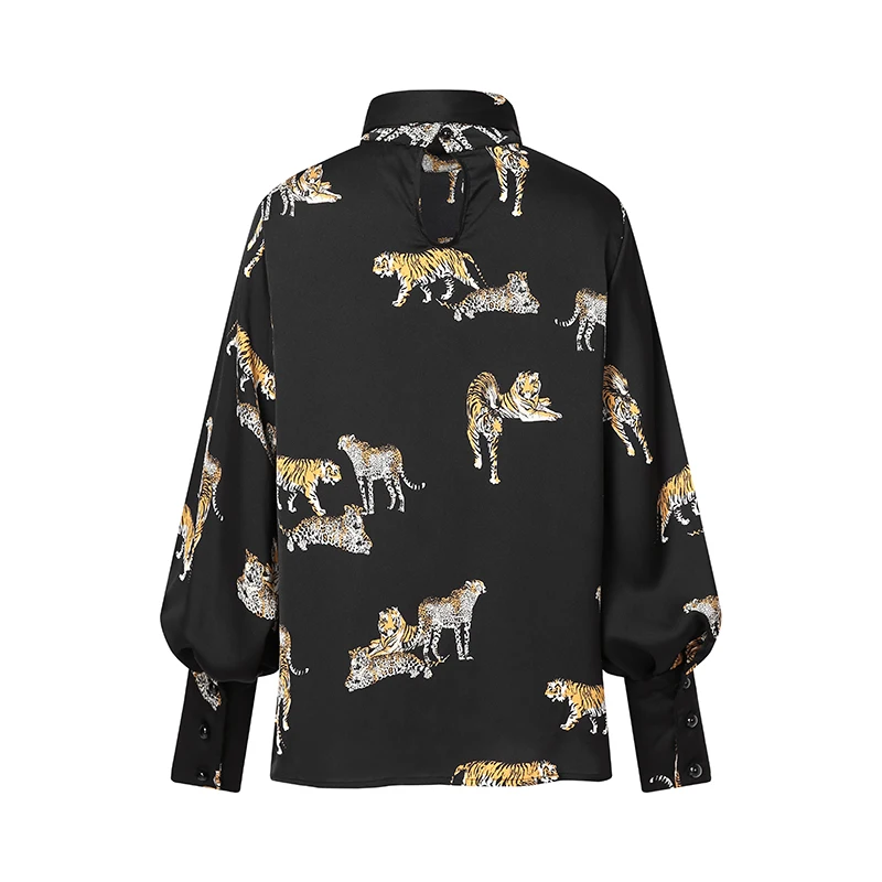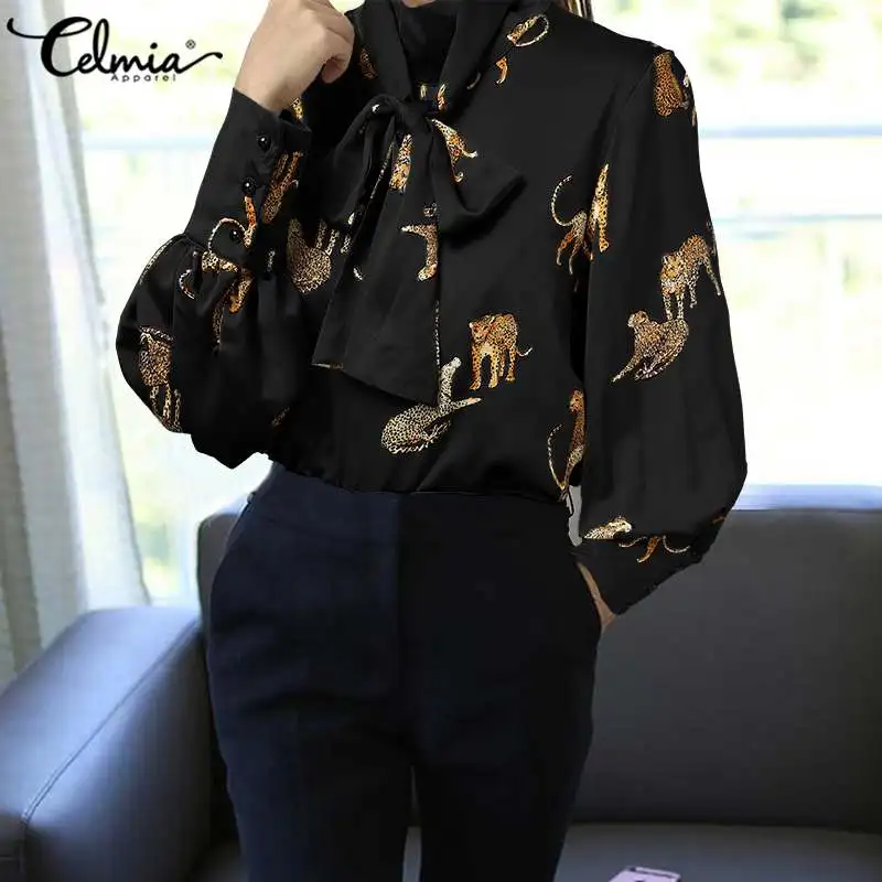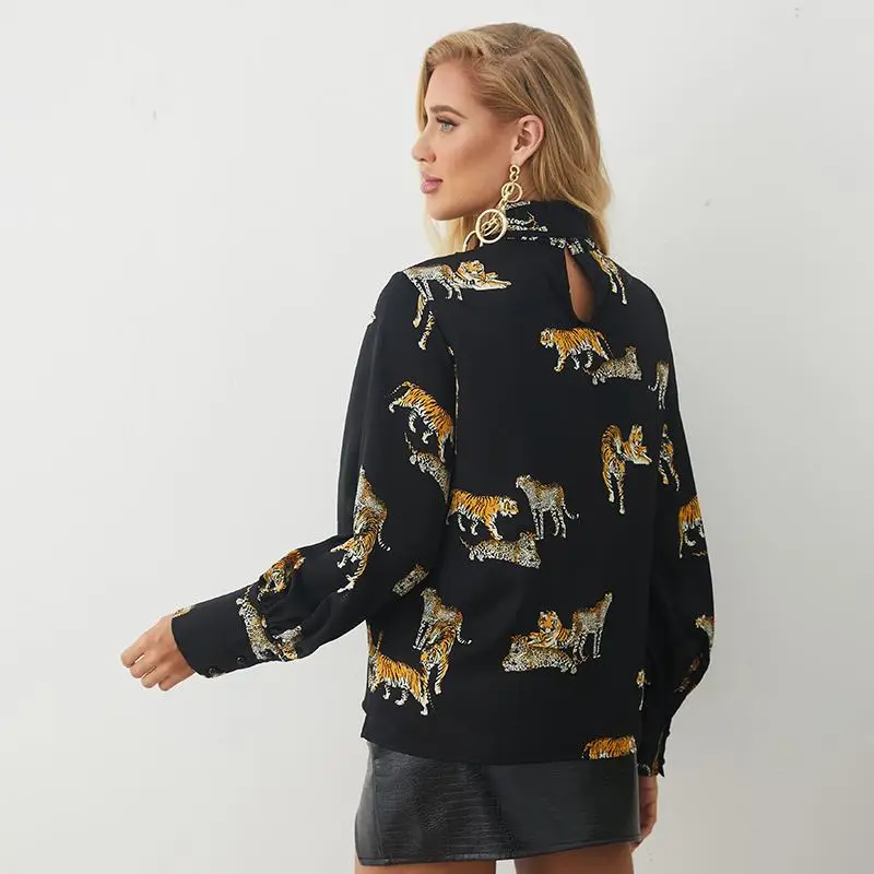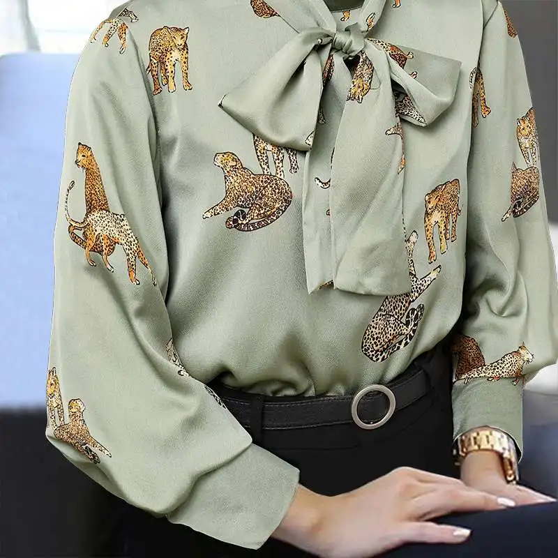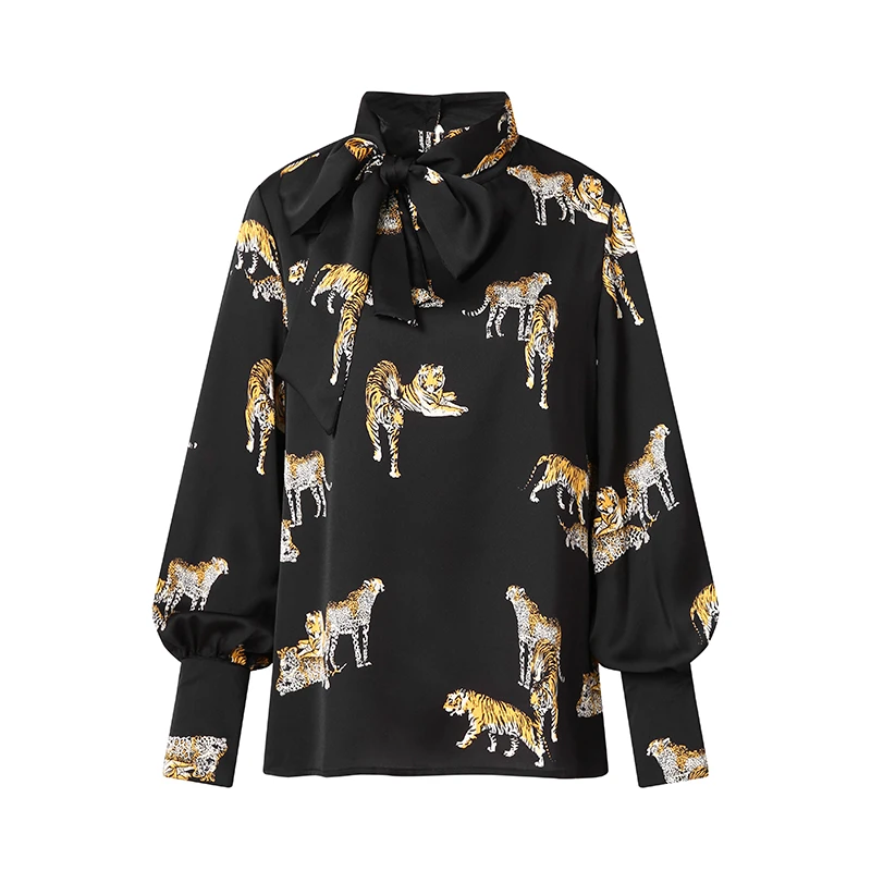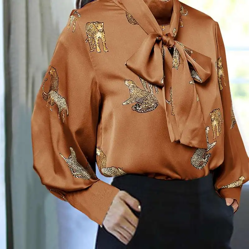 Женская винтажная блузка с длинными рукавами-фонариками, элегантная рубашка с галстуком-бабочкой, праздничные топы с принтом тигра и высоким воротником, туника