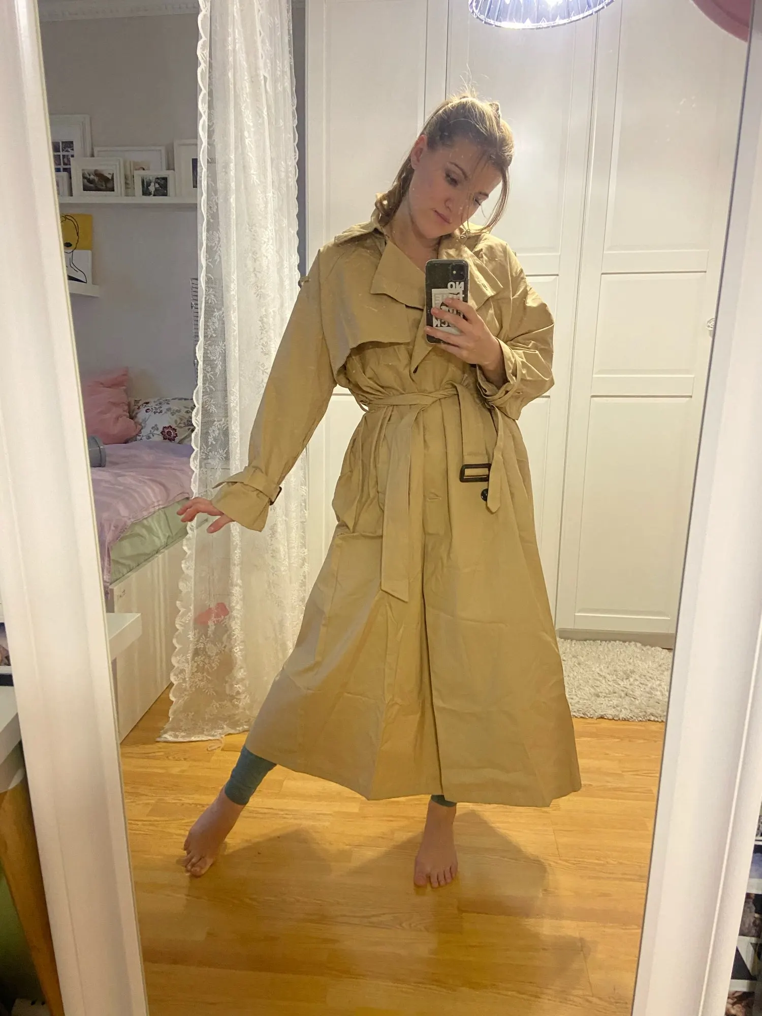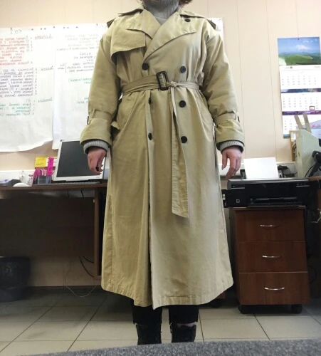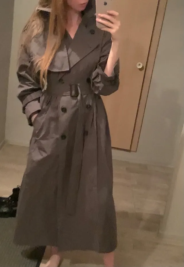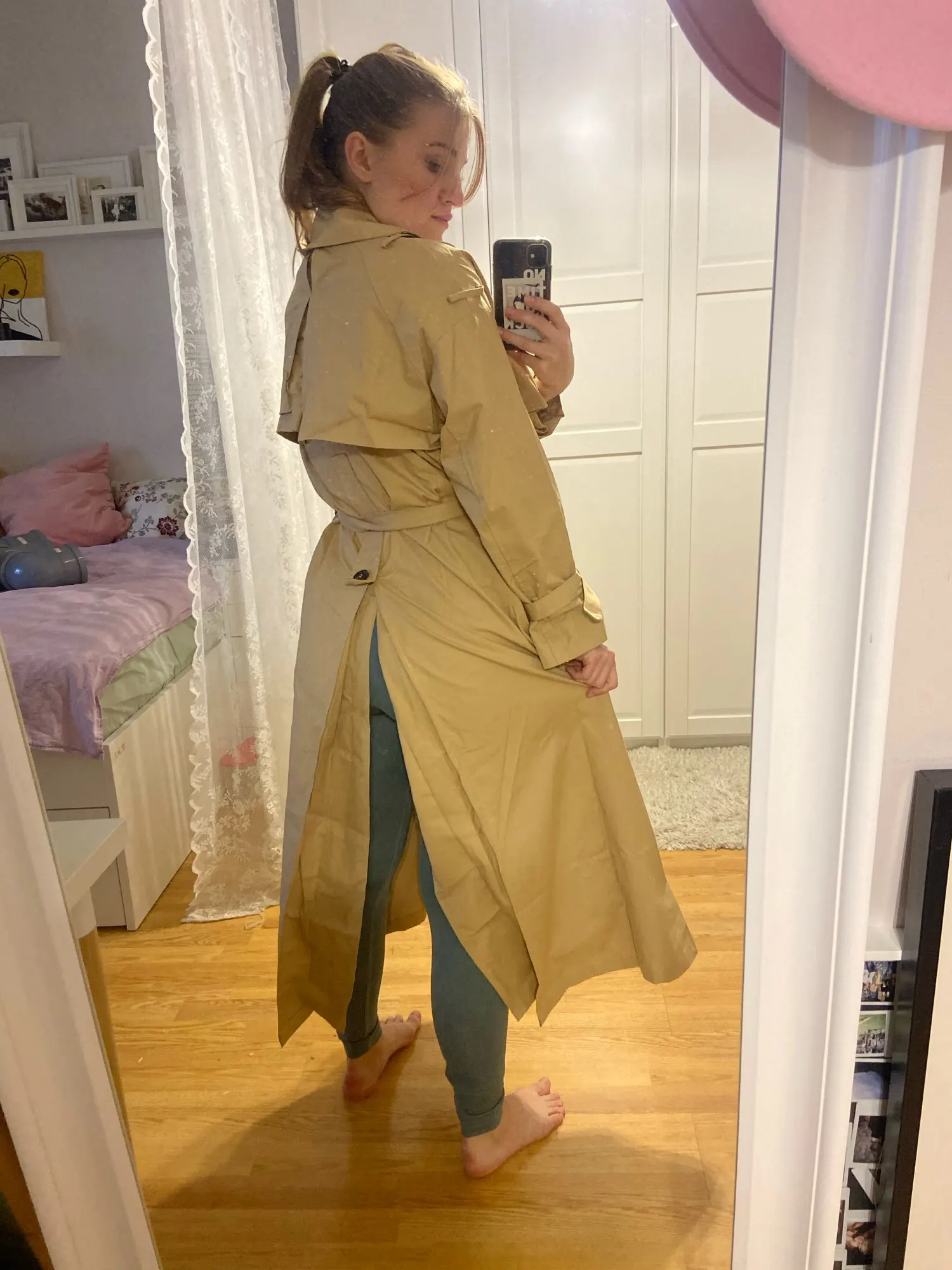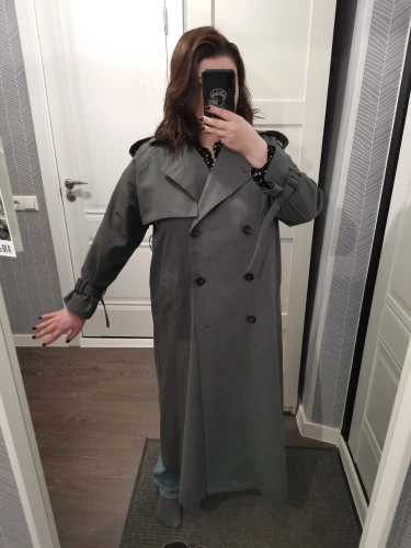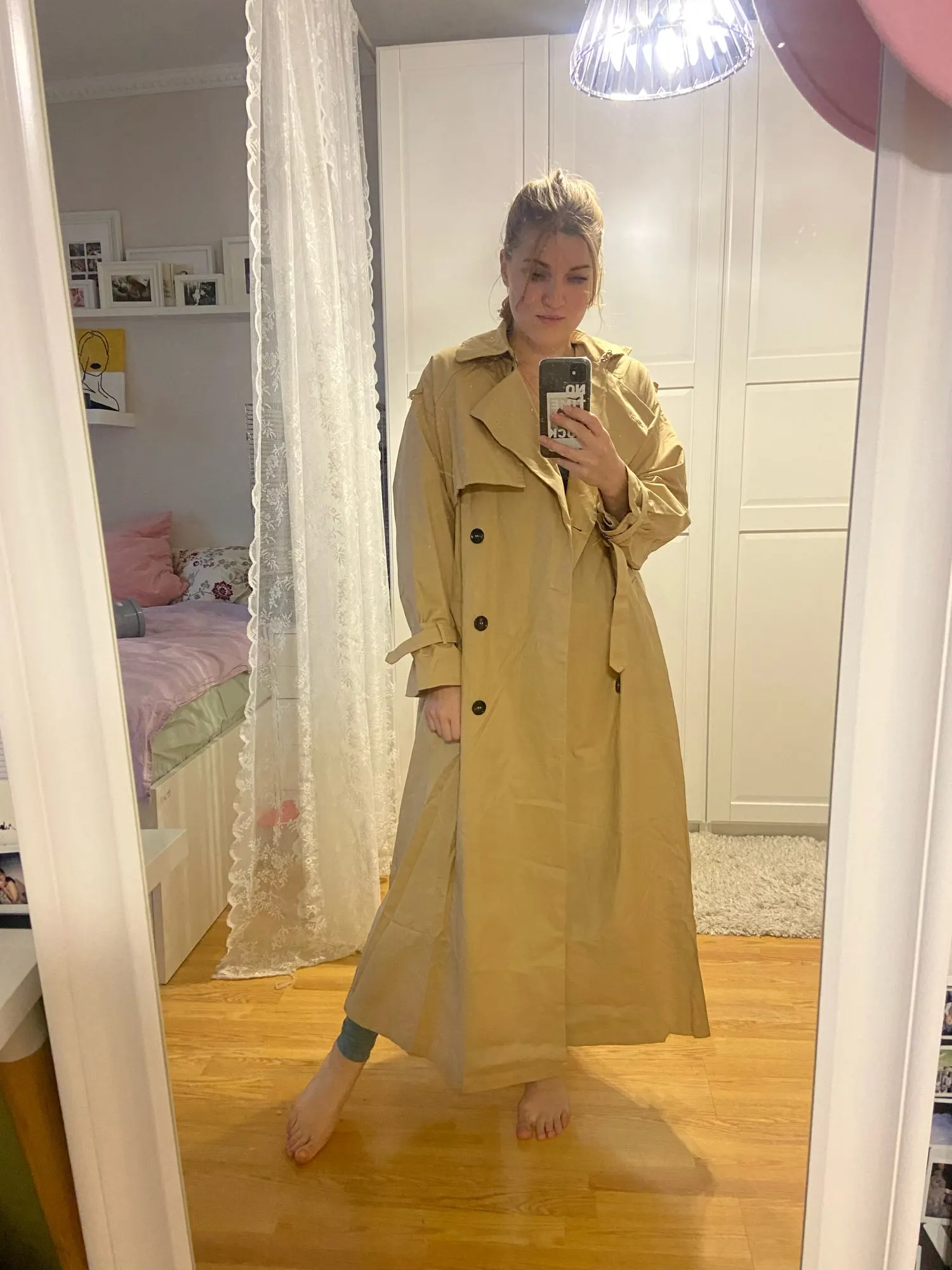 Офигенный тренч! Самая бытовая доставка за 7 дней до Московской области. Качество супер, материал приятный. Длина на рост 172 чуть ниже середины икры. На свой S купила S, оверсайз как и хотела. Рукава только коротковаты, но в общей массе выглядит норм. Очень рекомендую!