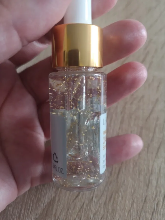 Не знаю как в действии, но выглядит очень не плохо. Аккуратно упакованный бутылёк с пипеткой. Прозрачная сыворотка с мелкими золотинками)) заявлено, что убирает морщины, сомневаюсь конечно))) но для увлажнения, думаю в самый раз.