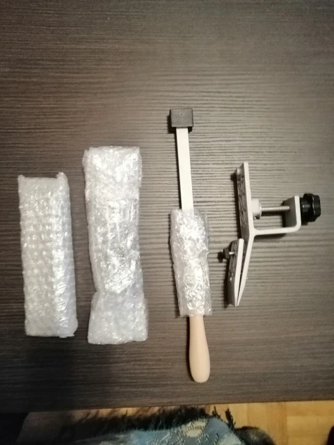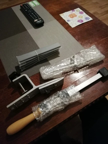 Заказ привезли за 5 дней из России, все упаковано качественно. Собрал без каких либо проблем, конструктив монолитный, люфтов нету, штанги и барашки нержавейка. Бруски в комплекте одинаковой высоты и имеют плоскость, не горбатые. Смутило что пластиковая загогулина на держателе брусков куда вкручивается штанга, криво приклеена, из за чего штанга смотрит в бок и поверхность корпуса обработана не очень, есть облой и следы от формы.