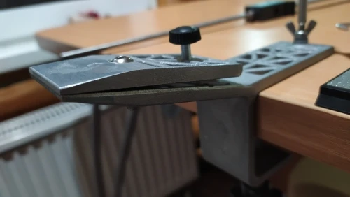 Приспособление требует доработки. Ничто не фиксируется. Постоянно нужно поправлять. С большим трудом заточил 6 ножей. Потратил на это полтора часа.